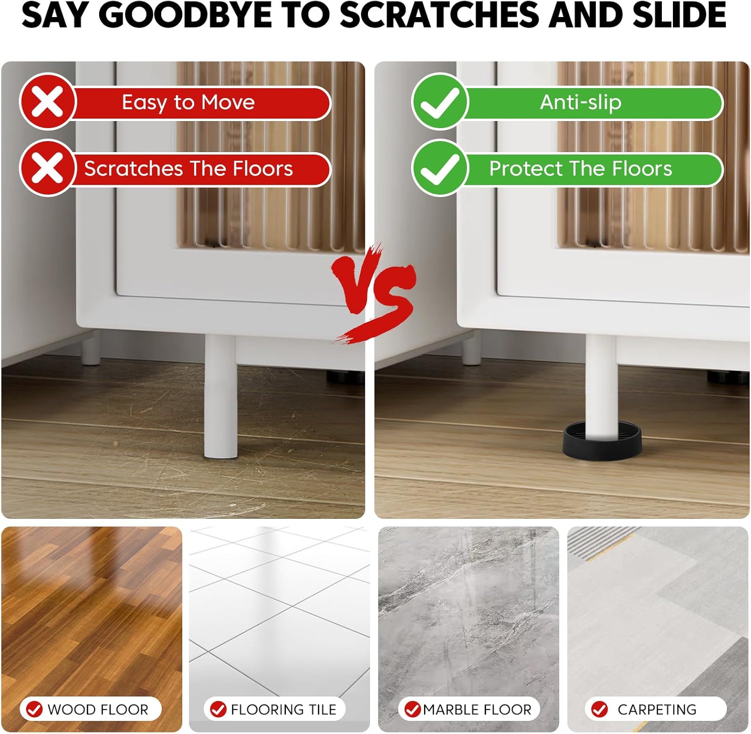 • FLOOR PROTECTION: This furniture leg floor protectors prevents damage to floors during furniture movement, prevents scratches to floors and provides optimal protection for all types of floors, including hardwood, tile and laminate.