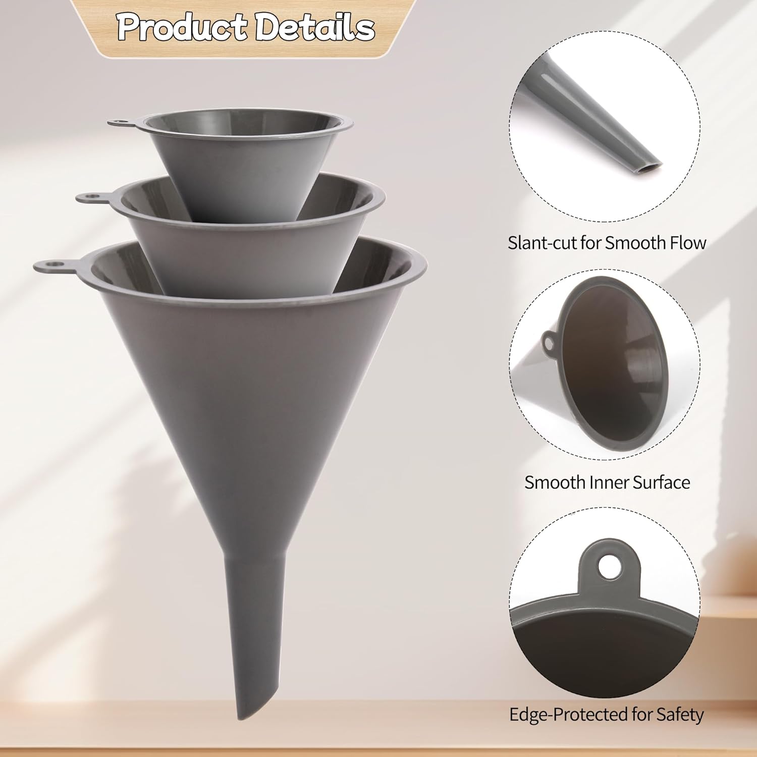 - 【𝐂𝐨𝐦𝐩𝐥𝐞𝐭𝐞 𝐒𝐞𝐭 𝐟𝐨𝐫 𝐃𝐢𝐯𝐞𝐫𝐬𝐞 𝐍𝐞𝐞𝐝𝐬】Our funnel set includes 3 different diameters (4.72inch, 3.92inch, 2.95inch) to meet a wide range of needs. Whether you're transferring liquids or powders, these funnels ensure precise and careful transfers for all your tasks. These kitchen funnels are perfect for filling bottles, jars, and containers, making them ideal for everyday use in the kitchen.