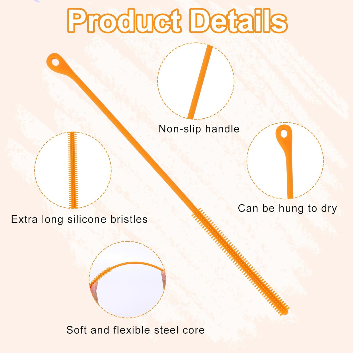2pcs Silicone Straw Brush, 9.5in Straw Cleaner Brush Extra Long Cleaning Brushes Reusable Travel Drinking Bottle Lid Cleaning Tool for Stanley Metal Glass Straws (Orange)