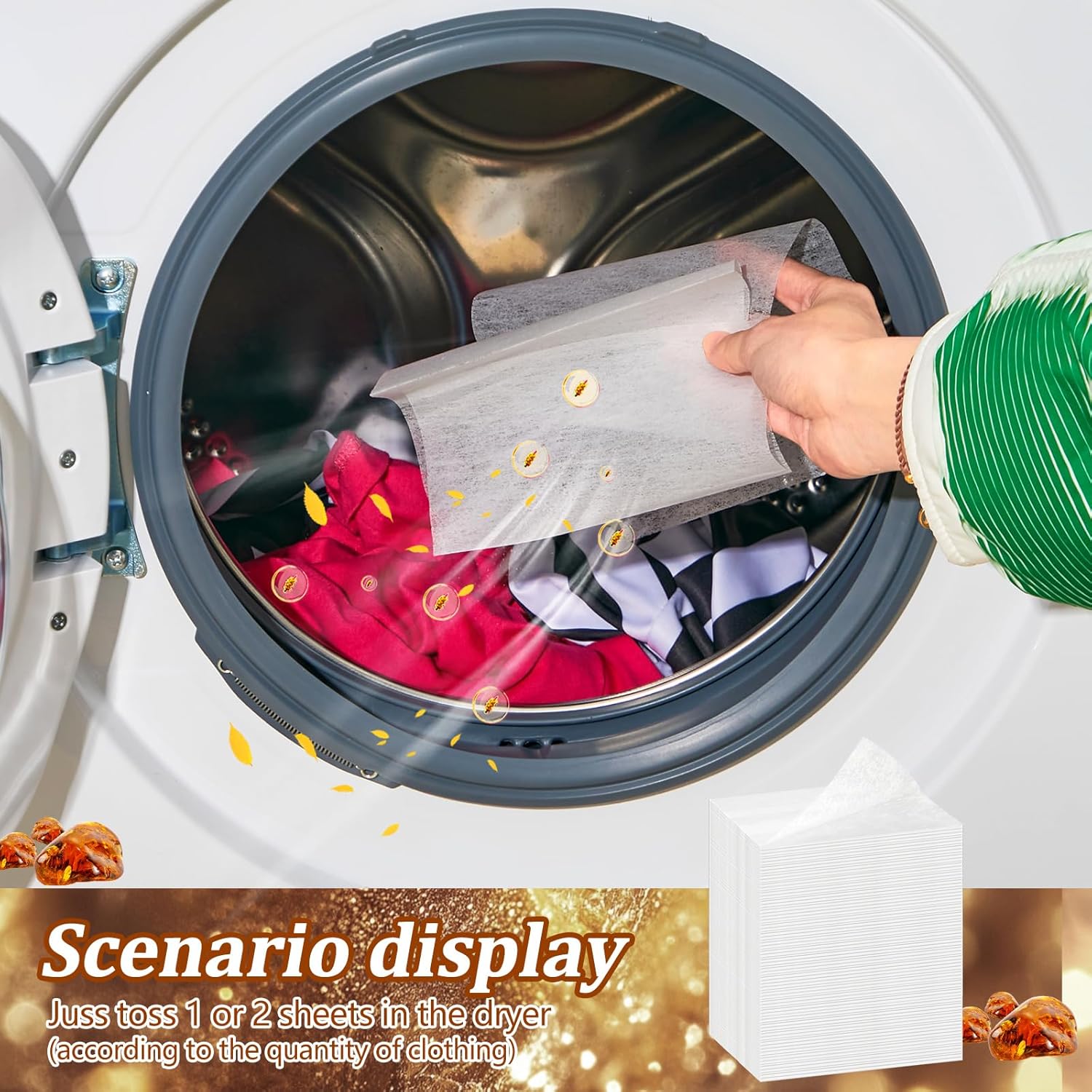 • Warm Note on Usage: for better results, we recommend using the appropriate number of dryer sheets scented depending on the load of clothes and the level of fragrance desired, 2 sheets can be applied for a large amount of clothing; Please recycle the paper after use