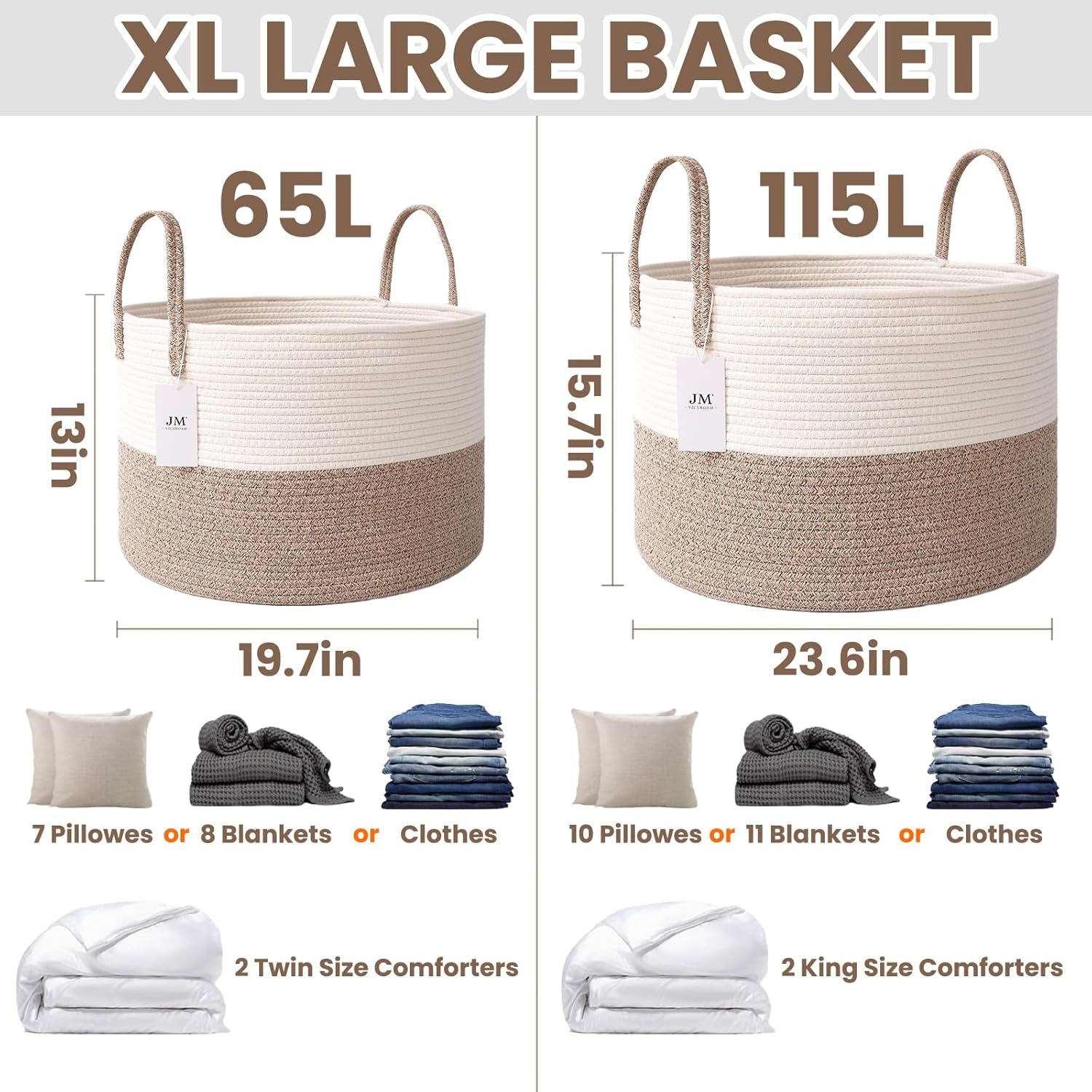 Woven Blanket Basket,115L Large Rope Storage Bin with Handles, Organizer for Blankets Toys Book and Clothes, Laundry Basket for Living Room Bedroom Nursery,White&Brown
