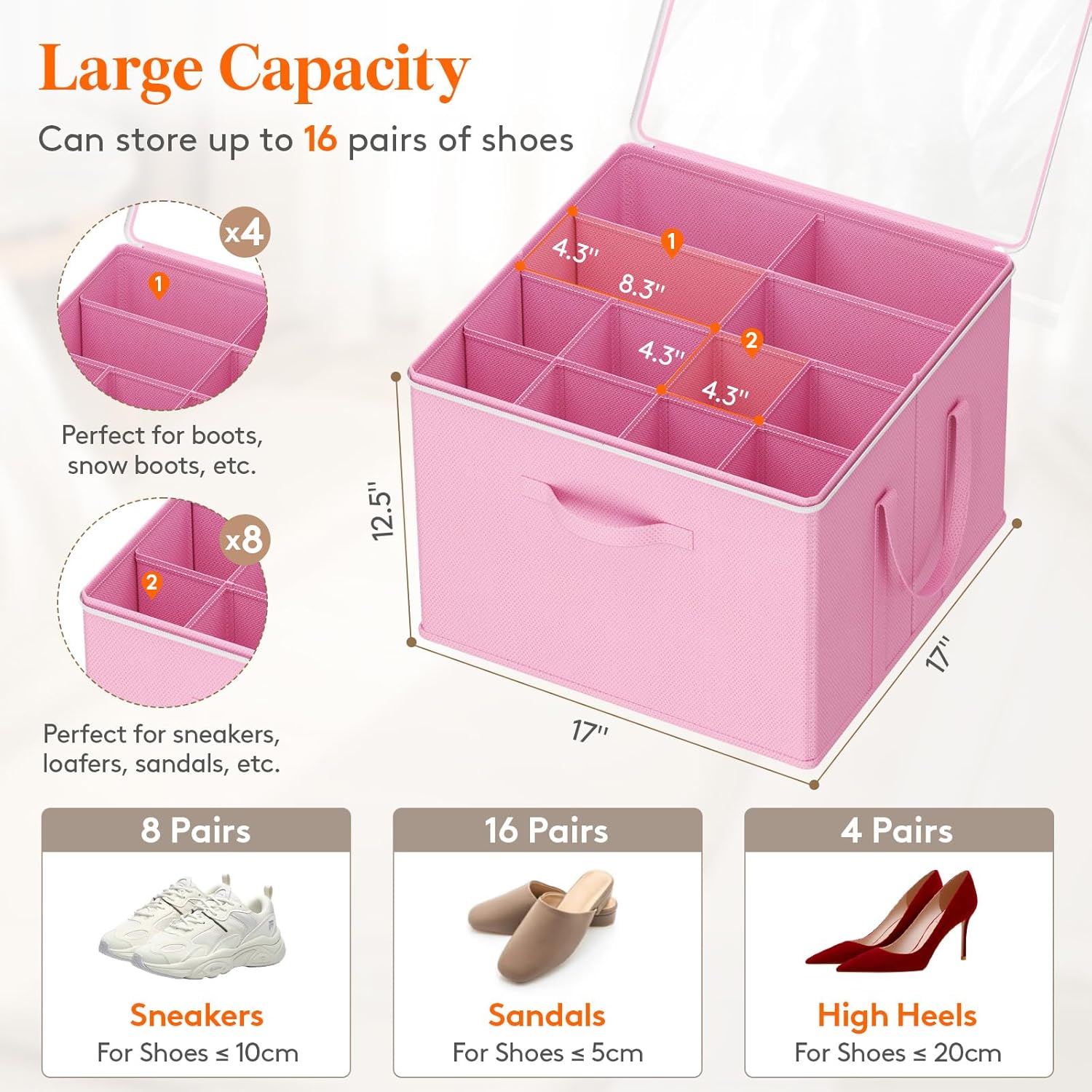 • Spacious Capacity: This 17"x17"x12.5" (43x43x32cm) shoe organizer holds 12-16 pairs. It features 8 small (11x11cm) and 4 large (21x14cm) compartments for all footwear types. Measure the length, width, and height of the room where you plan to place the box
