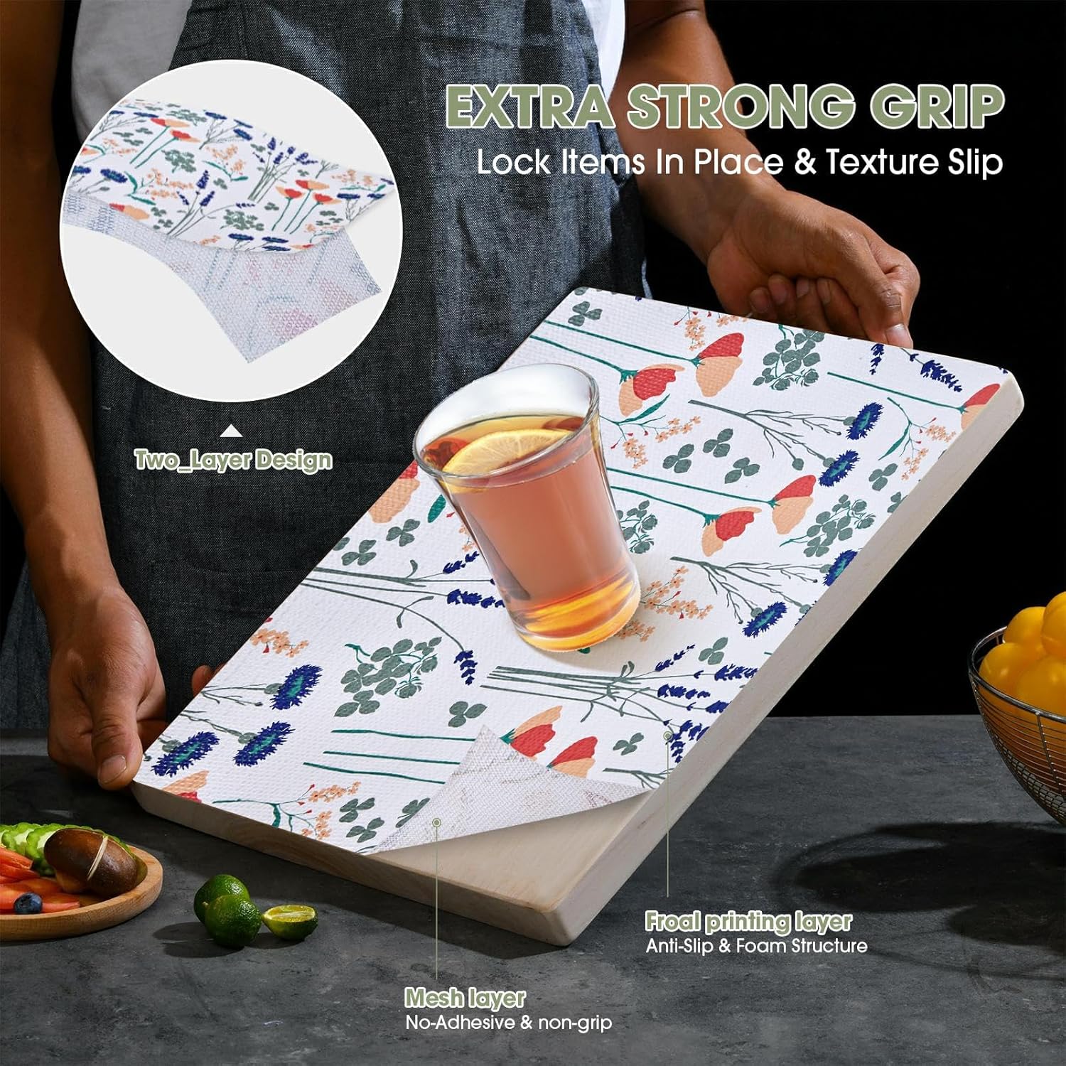 - Floral Shelf Liner【Lock Items in Place, Strong Grip】 Engineered with premium, thick 1.2mm BPA-Free & Odorless and food-safe PVC material, the EAQQWWY kitchen liner features a double-sided, heavy-duty textured grip. Its superior friction technology locks dishes, jars, and kitchenware firmly in place, preventing slips and shifts even during vibrations or drawer movement. The tear-resistant, crush-proof design offers dual protection: safeguarding your valuables and cabinet surfaces from scratches, scuffs, and stubborn stains.