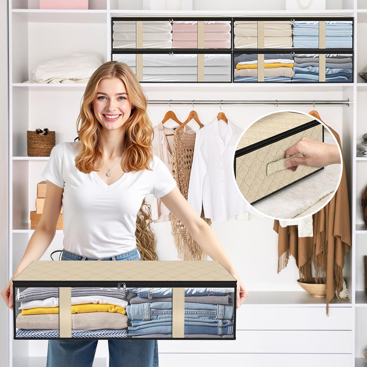 • Reinforced Handles:The sturdy stitched handles are convenient to pull the storage bag and to carry easily. On each side of the storage bag so it is convenient to pull the clothes storage out from under the bed