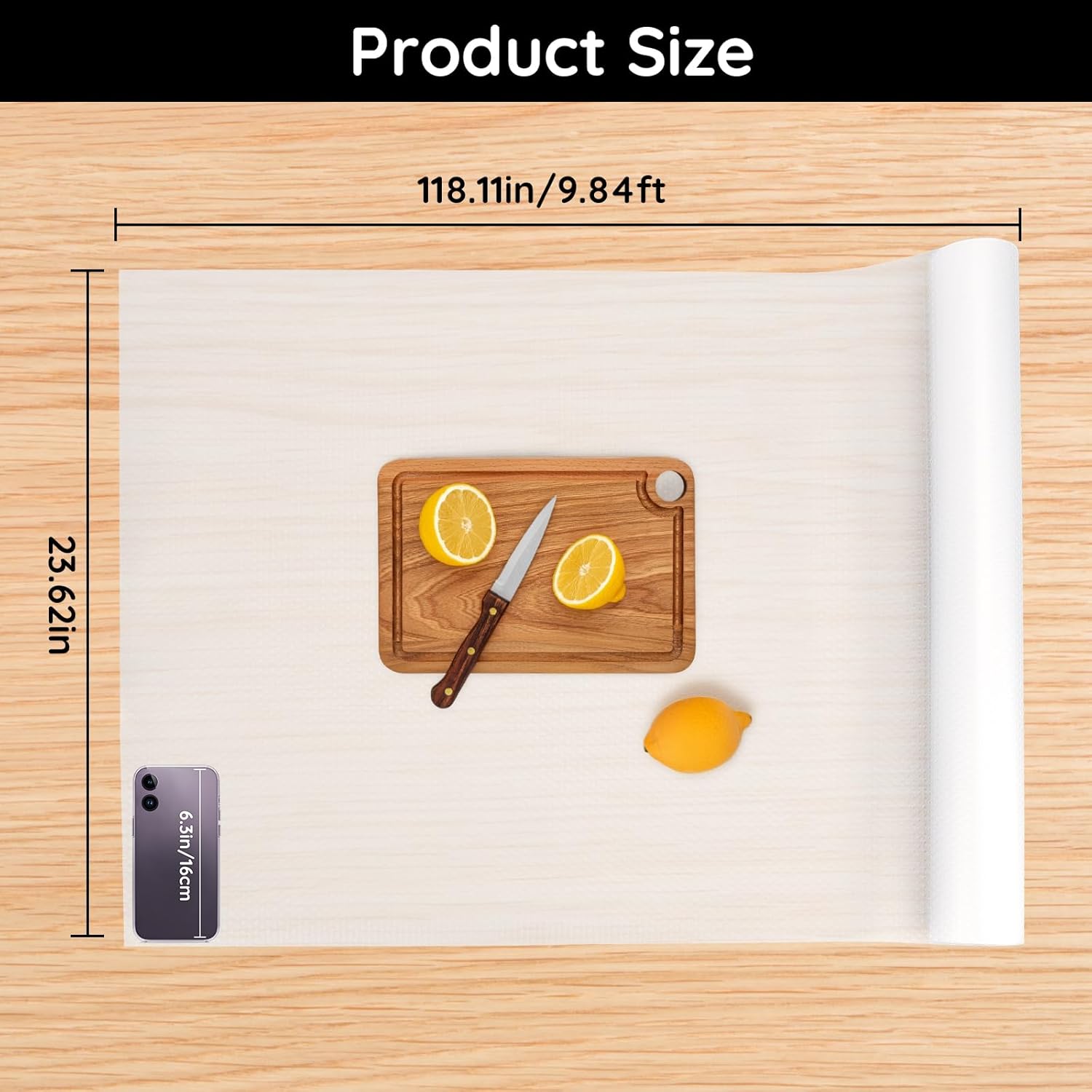 • 【Easy to Trim】Size: 23.62"W x 118.11"L x 0.03"T. The kitchen cabinet liner can be freely cut into different shapes with scissors. Customize it to fit unique drawer, cabinet, or shelf sizes, making it both practical and neat for your space.