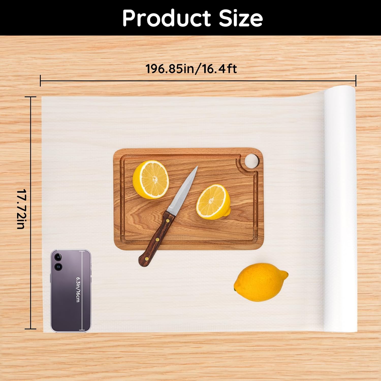 • 【Easy to Trim】Size: 17.72"W x 196.85"L x 0.03"T. The kitchen cabinet liner can be freely cut into different shapes with scissors. Customize it to fit unique drawer, cabinet, or shelf sizes, making it both practical and neat for your space.