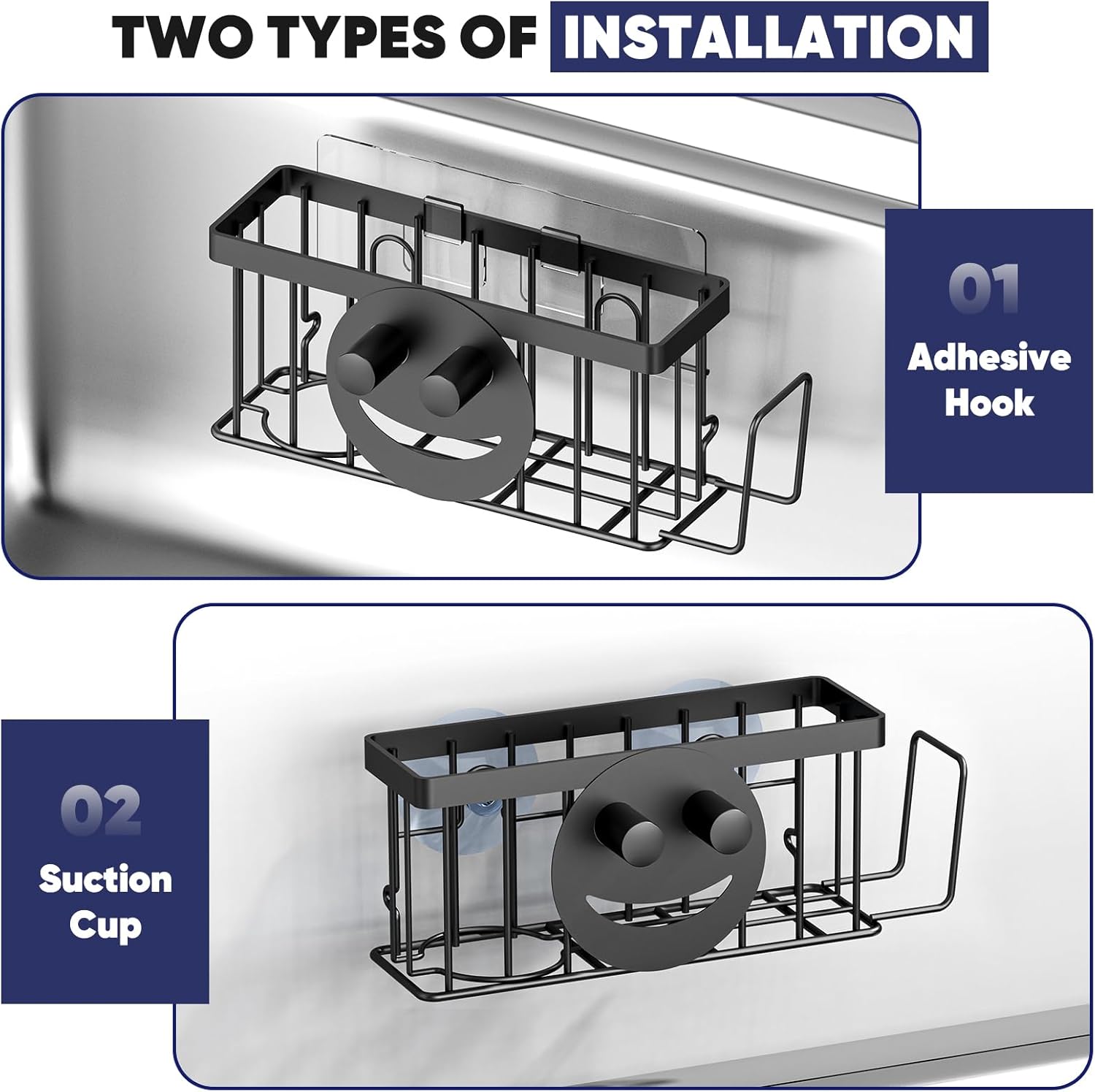 Sponge Holder for Kitchen Sink,Sink Caddy Smiley Face,4-in-1 Sponge Holder with Suction Cups & 1 PCS Adhesive Strips for Holding Soap,Brush,Scrubber,Sponge,Stopper-Black