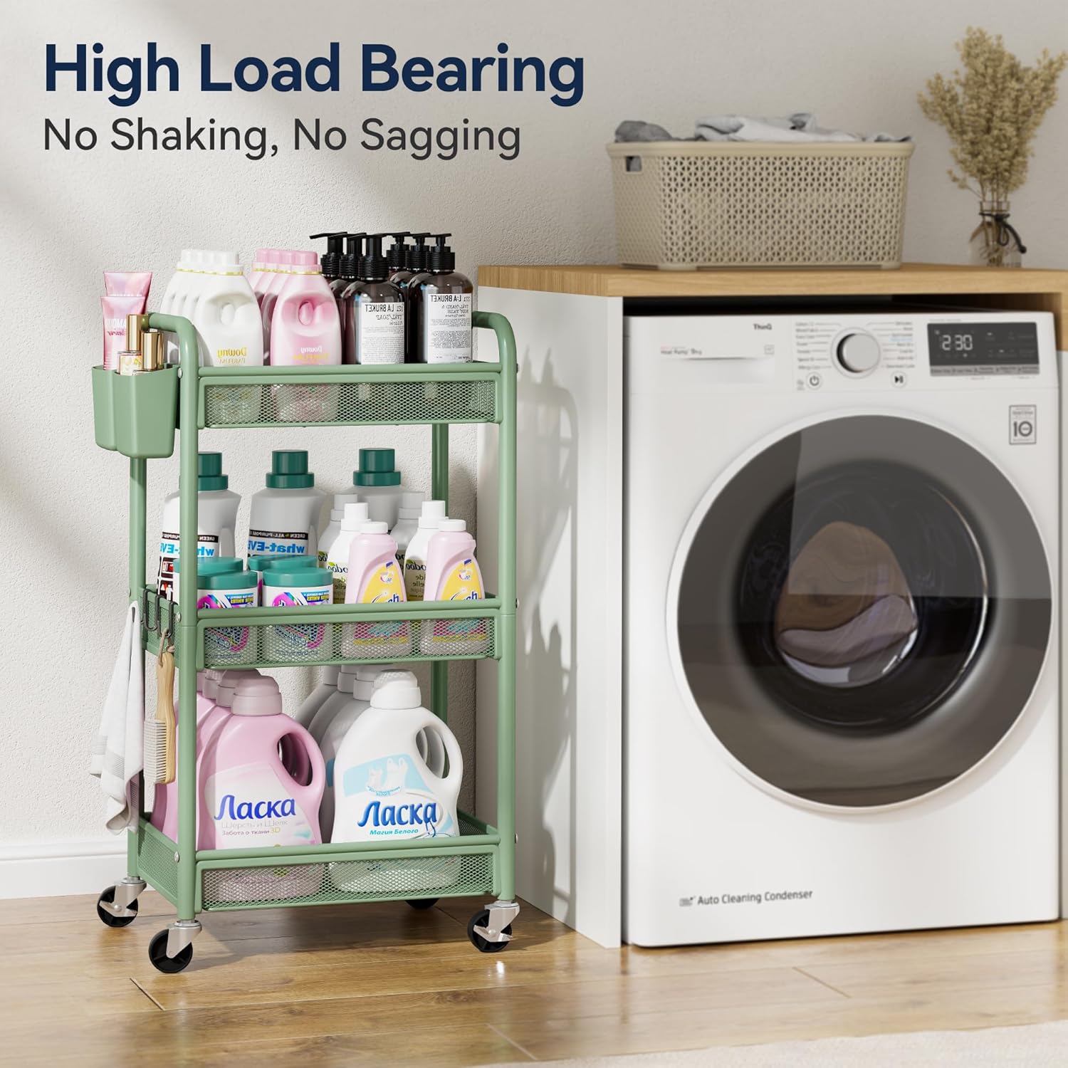 YASONIC 3 Tier Rolling Cart – Metal Utility Storage Cart with Wheels, Craft Carts Organizer with Hanging Cups, Hooks, Mesh Basket for Bedside Kitchen Office Art, Green