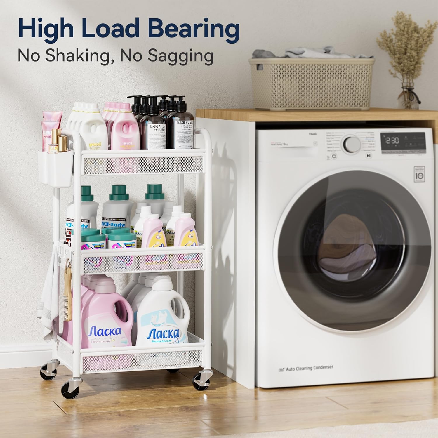 - Larger Storage Capacity, Multifunctional Storage: Featuring 3 spacious metal baskets, 2 hanging cups, and 3 hooks, this rolling carts with wheels offers extra storage for any occasion. Use it as art car, craft cart, makeup cart, bathroom cart, bedside cart or diaper cart
