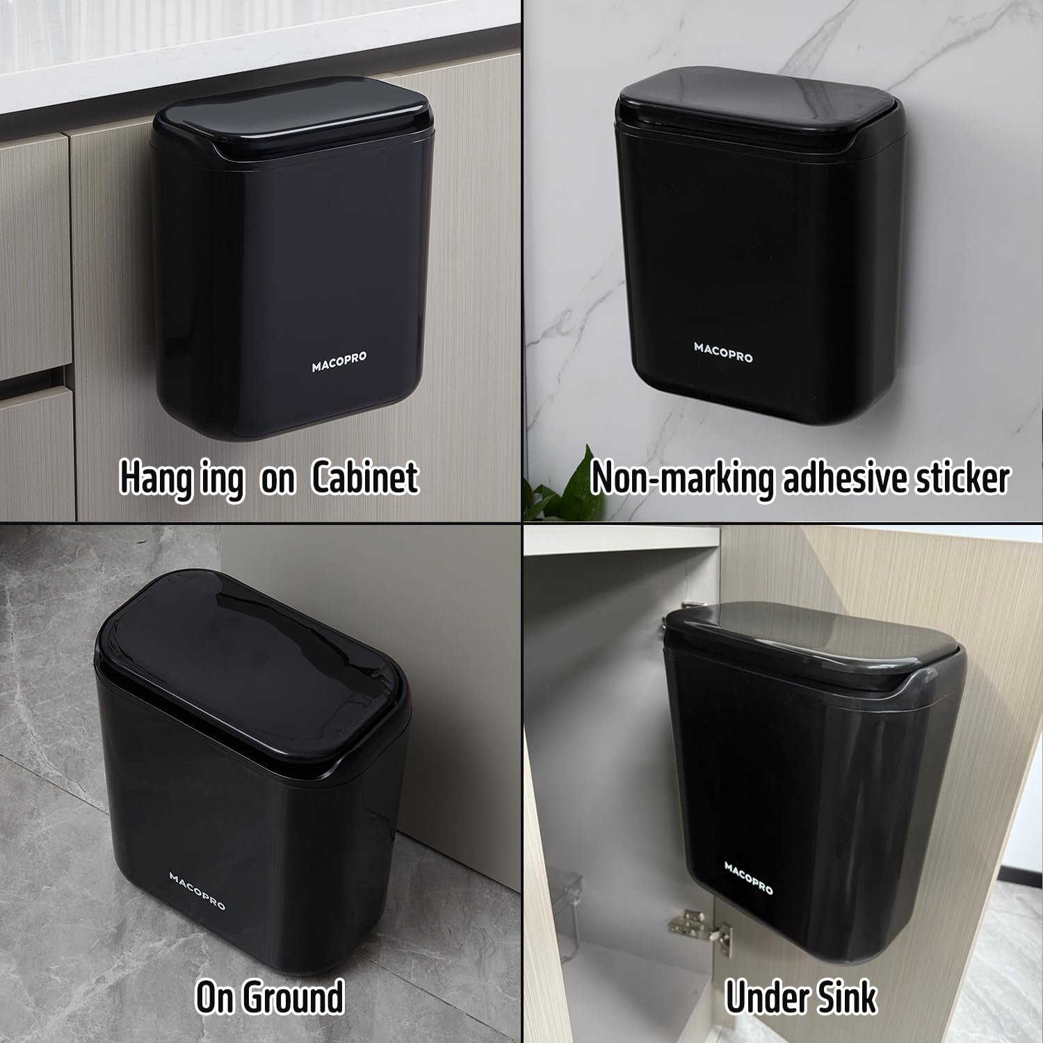 - Stable Installation, Thoughtful Details:It uses a special hook for hanging bin and adhesive pad for installation, no need for drilling, and is stable whether hung as a cabinet door trash can or stuck on the wall. The bucket body has a built-in fixing structure, and with the design of small trash bin with lid, it prevents garbage bags from slipping, making it more convenient to use.