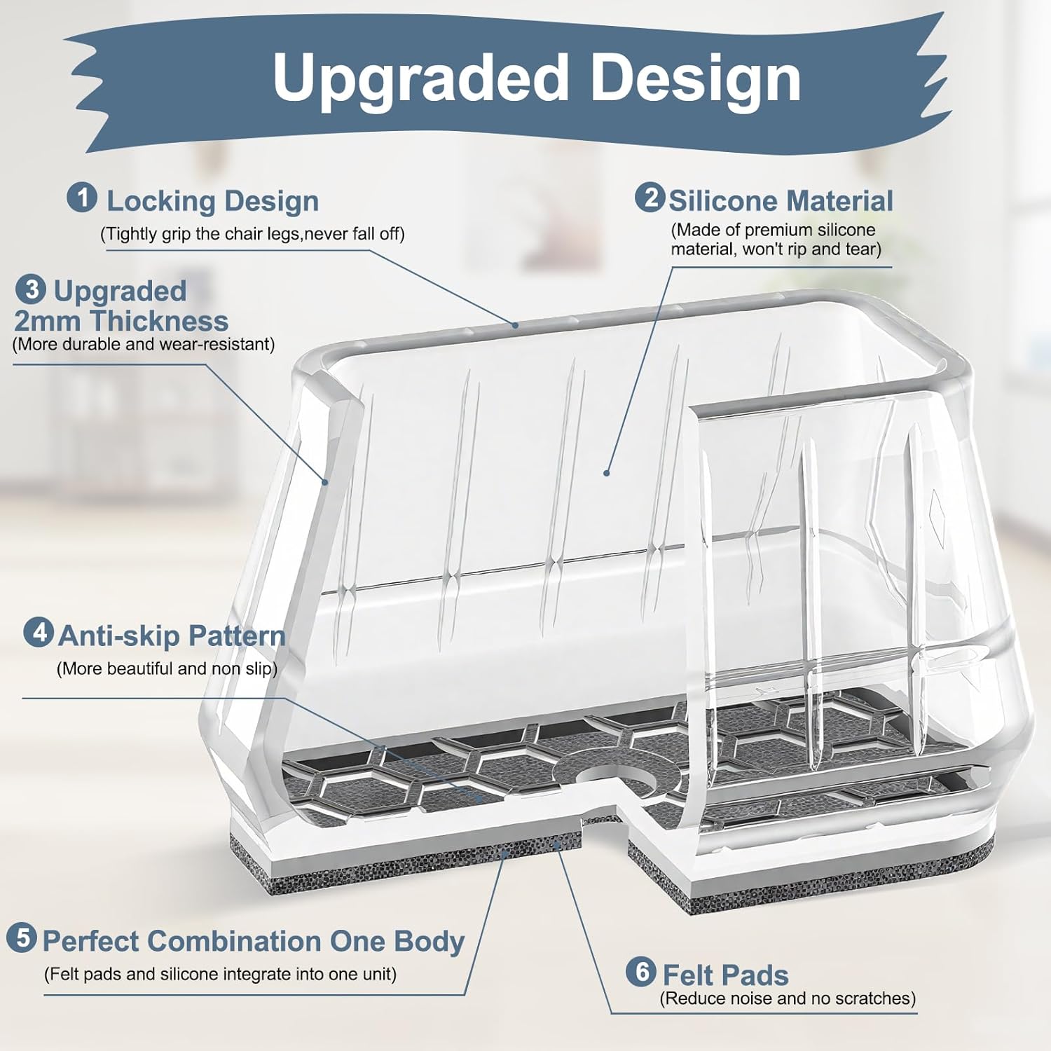 • ✅【Comprehensive Improvement】The chair leg floor protectors use special technology to combine the felt and silicone into one inseparable piece, which prevent the felt pad from falling off during use. We chose the premium quality silicone material which bonds the felt pad better, and won't tear easily when stretched.