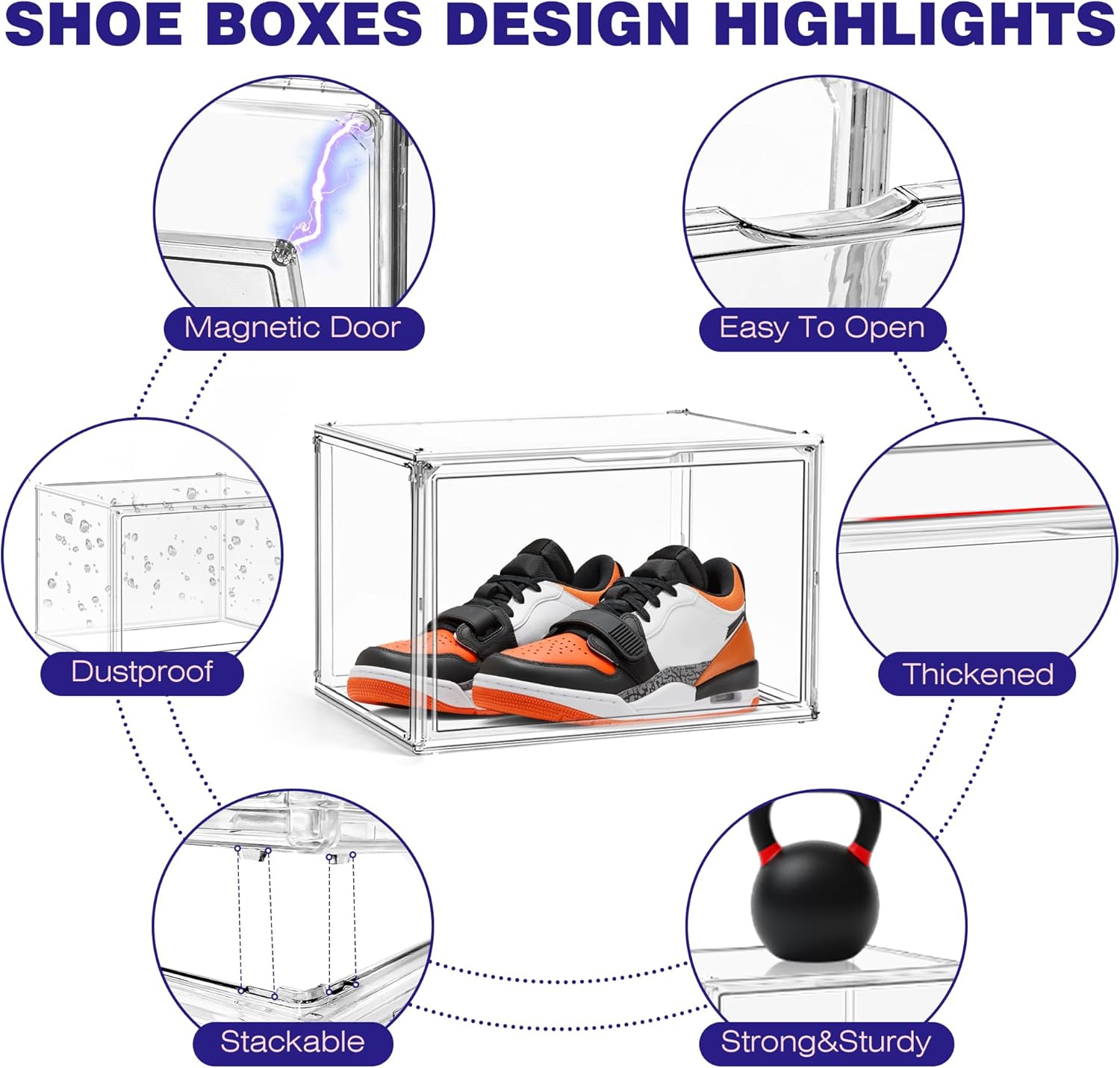 • Fit Your High-Tops: Each shoe crate measures 14.1" L x 10.6" W x 8.9" H, providing ample space for up to Men’s 15/Women’s 12 witho. The sturdy construction, made of thick high-hardness PET acrylic panels, ensures that your high-tops, sneakers, and boots are securely stored