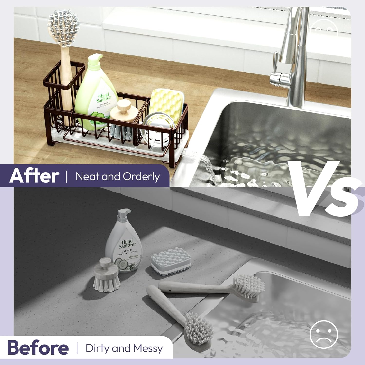 - [Unique Divided Space Sponge Caddy]: The baffle design divides the sink into three separate storage spaces-High brush holder desigh makes brush easy to place and maintains its beauty