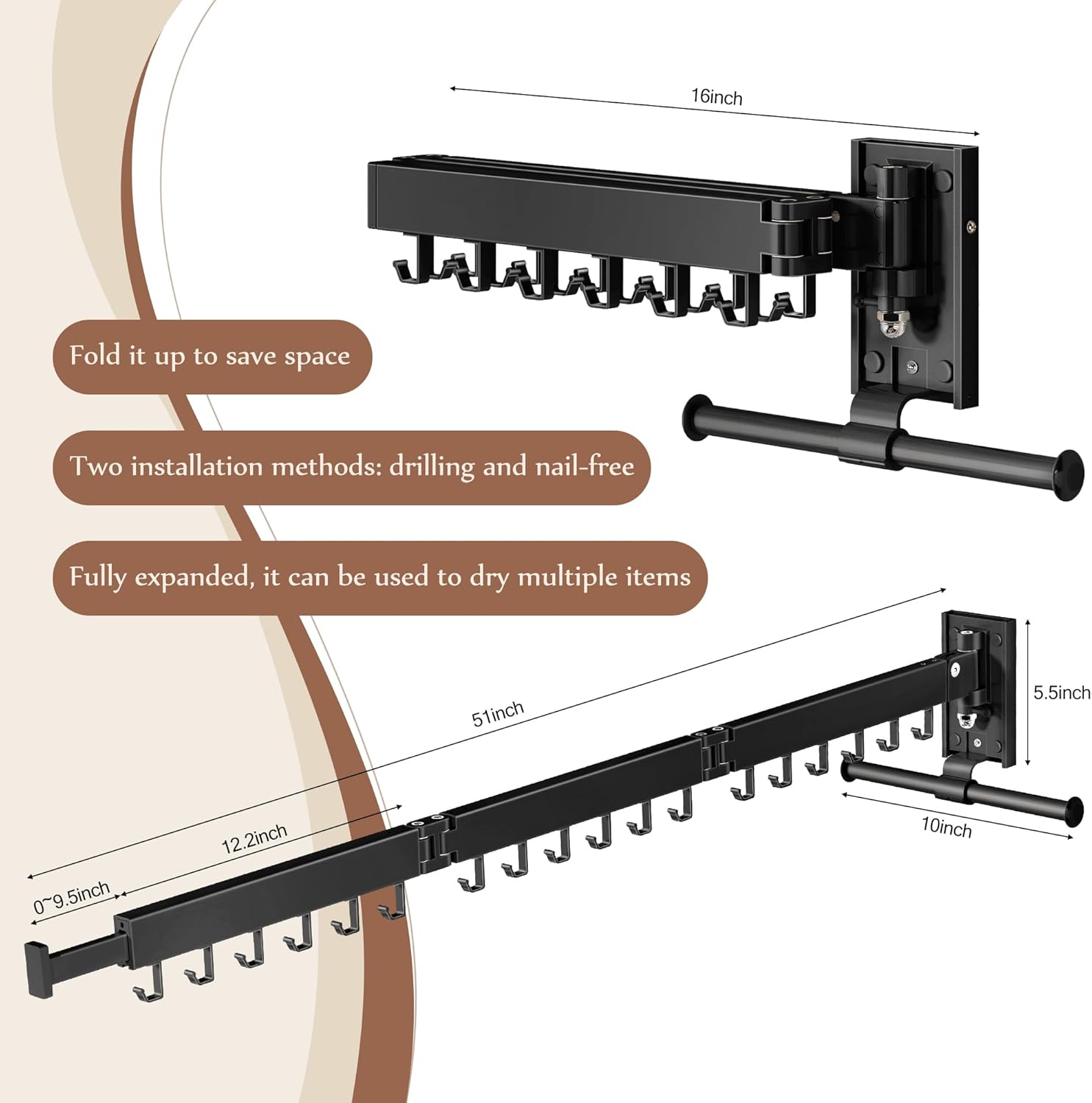 • Easy No-Drill Installation: Hassle-free setup with a simple wall-mounting system – no need to drill holes in your wall. Enjoy the convenience of a collapsible drying rack.