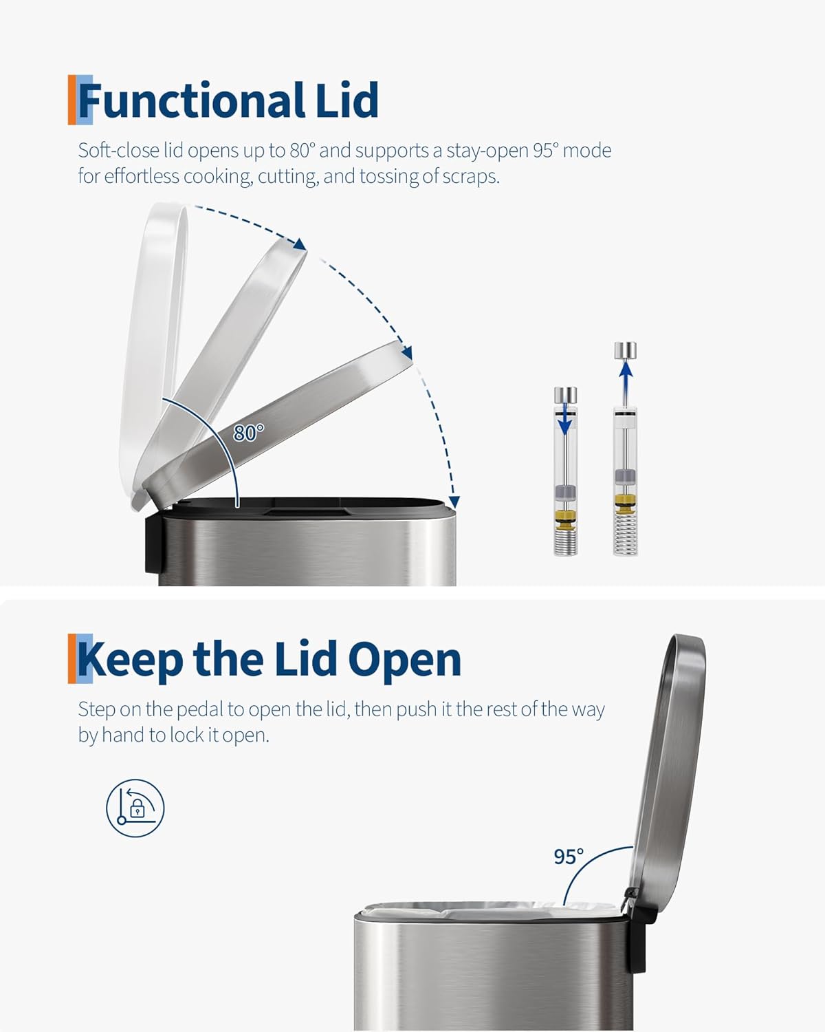 - [PRACTICAL DESIGN] – The Garvee’s tall step-on kitchen trash can prioritizes effortless operation. The ergonomic rear handle makes lifting and relocation a breeze. The soft-close lid glides open to 80° and locks at 95° for hands-free stay-open use. The inner bucket with lid traps odors, and the custom liner ring grips any standard bag to prevent slips, bunching, or overhang