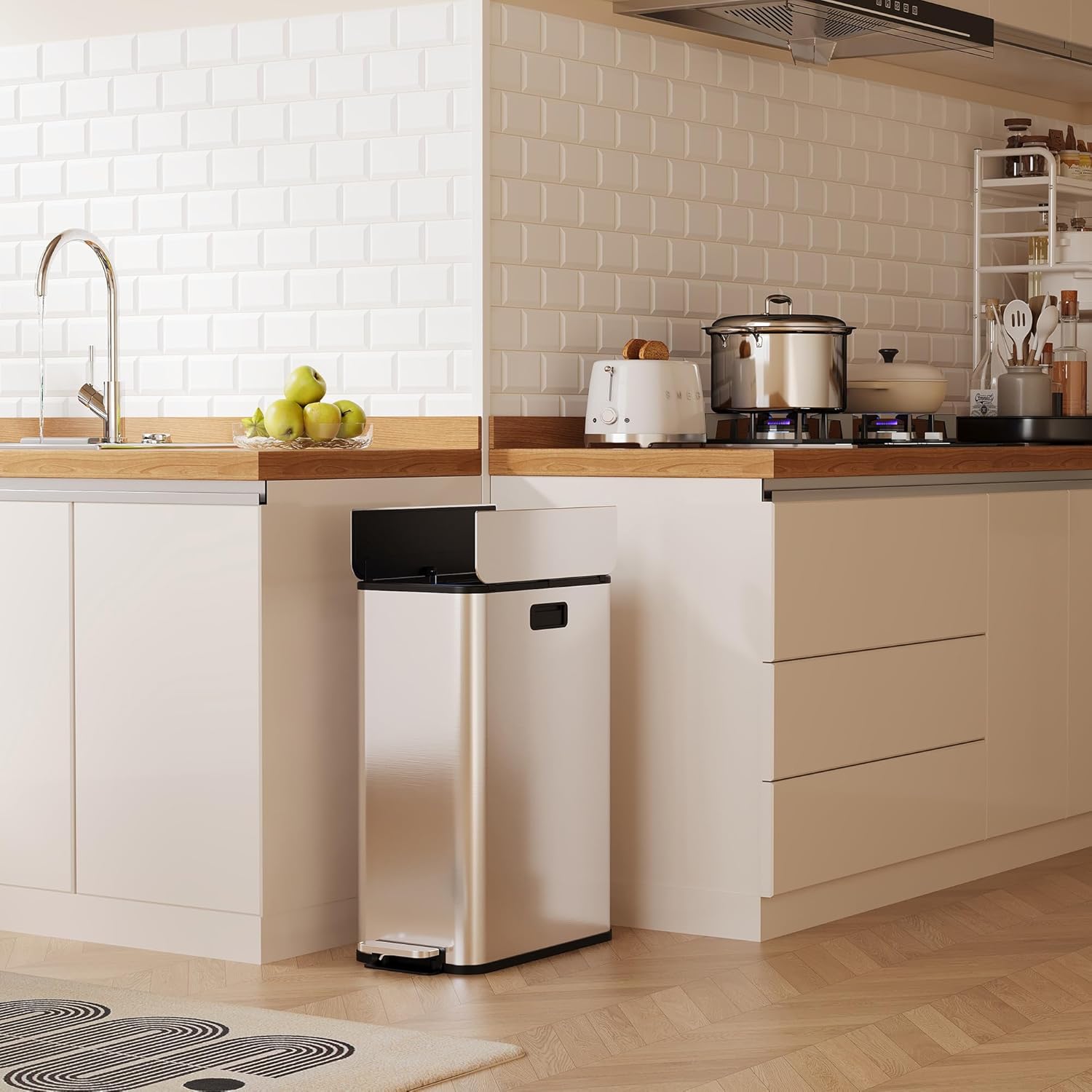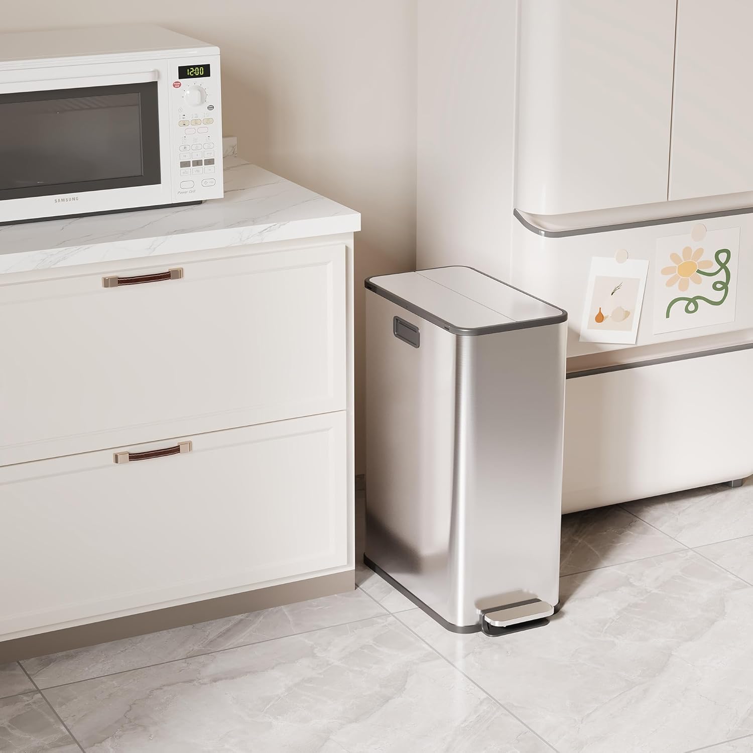 • Durable and Pet-Proof: Crafted from premium stainless steel, this dual compartment trash bin is built for long-term use. Its robust pedal and fully-sealed lid make it challenging for pets to manipulate, ensuring your waste stays secure