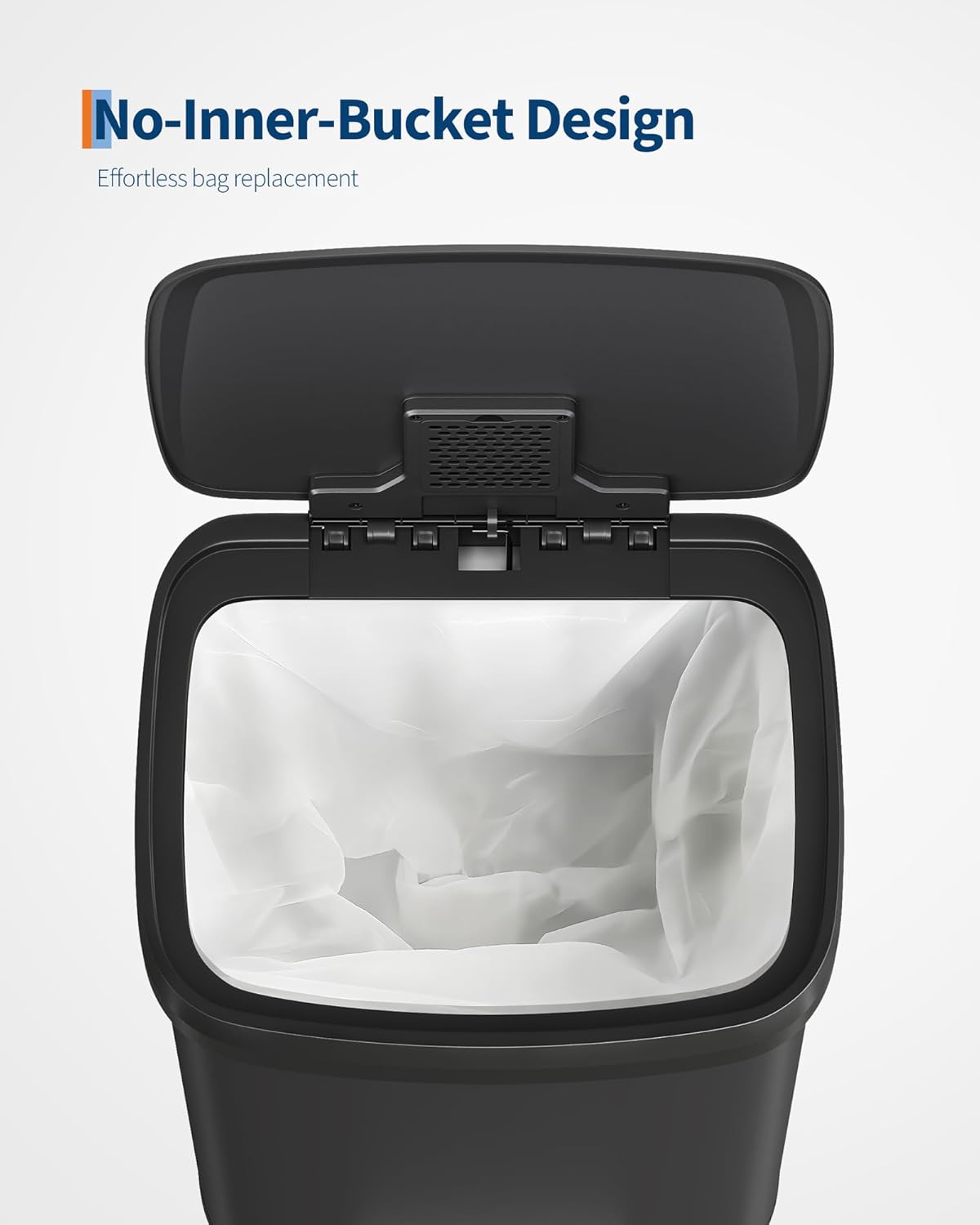 - [PRACTICAL DESIGN] – The Garvee’s tall step-on kitchen trash can prioritizes ease of use with an ergonomic rear handle for effortless lifting and relocation. The soft-close lid opens smoothly to 80° without hitting island edges and locks at 95° for hands-free cooking prep and scrap disposal. The integrated liner rim secures any standard bag snugly to prevent slips, bunching, or overhang