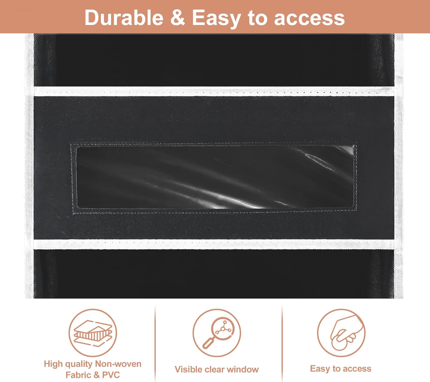- Anti-warping & Durable: Each tier of hanging organizer features a reinforced bottom cardboard, while the pocket windows are supported by built-in inverted U-shaped cardboard and a fiberglass rod. This design keeps the shelves in shape even when holding heavy items
