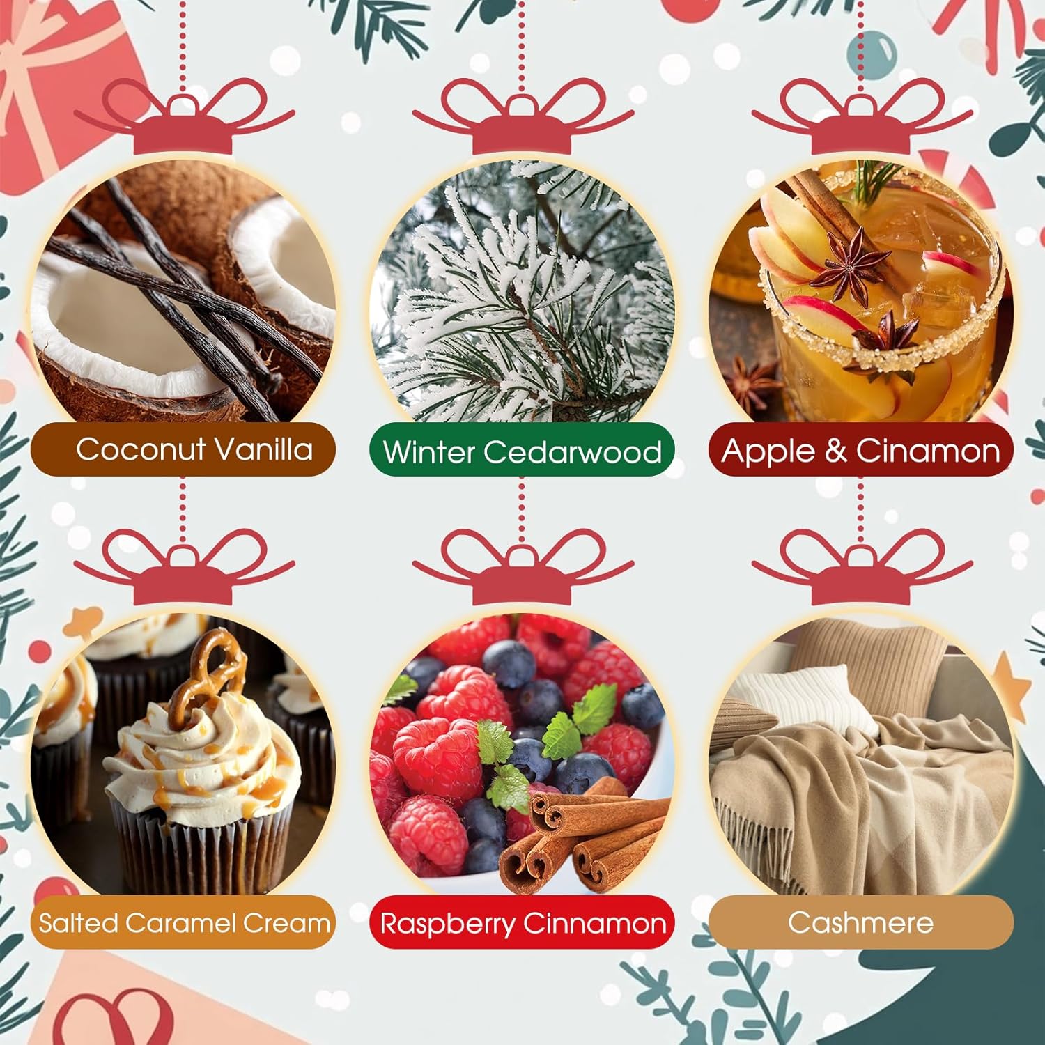 • [12 Christmas Scents Wax Melts] : Coconut Vanilla, Winter Cedarwood, Apple & Cinnamon, Salted Caramel Cream, Raspberry Cinnamon, Cashmere, Hot Chocolate, Warm Fireplace, Gingerbread, SANTA'S Cookies, Orange Cinnamon, Balsam Cedar