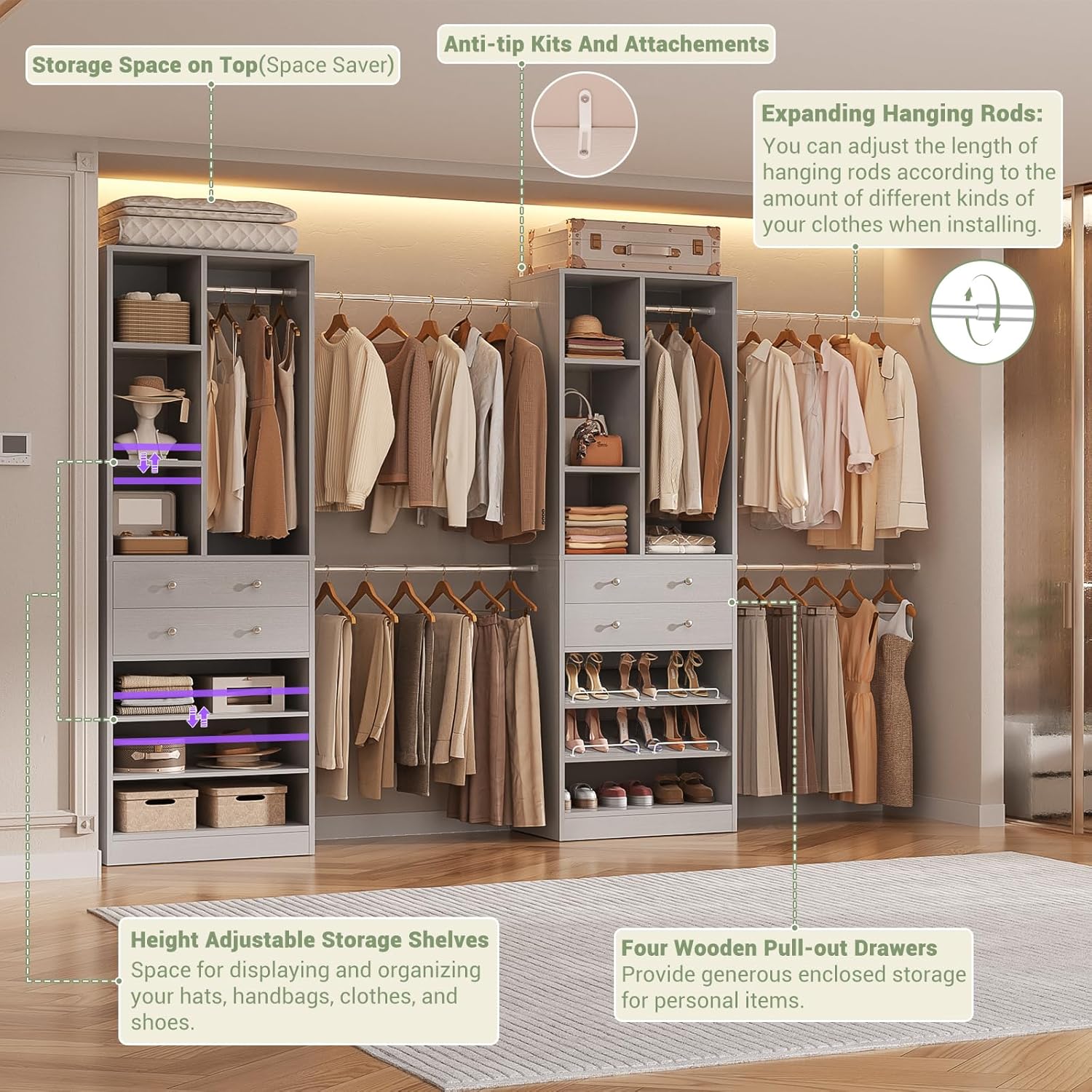 Closet System, Up to 134"/11.2 FT Closet Organizer with 4 Wooden Drawers and Shelves, Walk-in Closet System with 6 Hanging Rods, Built-in Closet Can Fit 96"/8FT, 120"/10FT, Morandi Grey