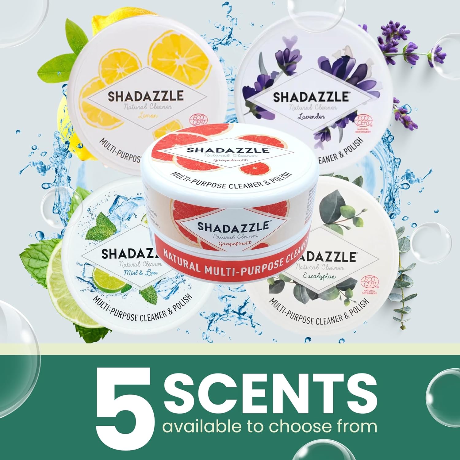 • NATURAL ALL PURPOSE CLEANER : Shadazzle is a multi purpose cleaner that works on any washable surface. It is made with natural ingredients only : clay, vegetal oil, vegetal glycerin, eucalyptus fragrance. No harmful chemicals or phosphates !