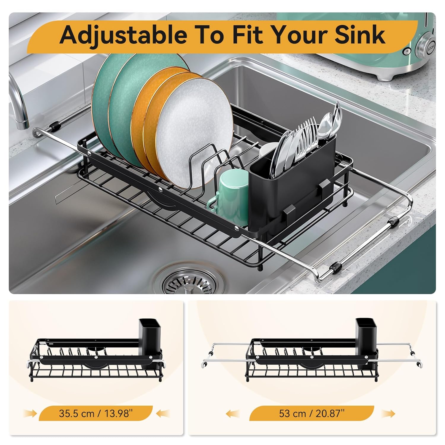 • [EXPANDABLE DESIGN]: Thanks to the extendable design, our over the sink dish drying rack adapts to various spaces. It spans sinks measuring 20.98"D x 9.61"W x 2.99"H. The adjustable 304 stainless steel support bars can expand from 13.98" to 20.87" to fit various sink sizes.