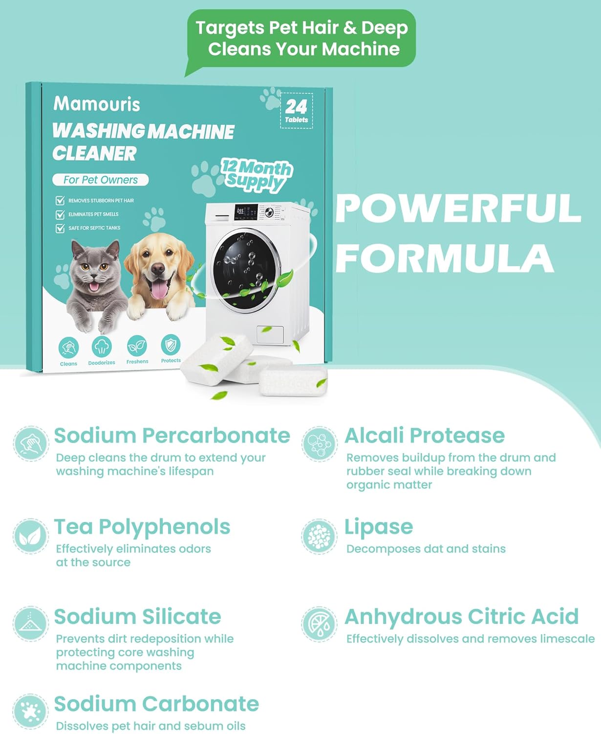 Washing Machine Cleaner Tablets: 24 Pack Deep Cleaning For HE, Front Loader & Top Load Washer, Removes Pet Hair, Odors, Formulated for Pet Owners, Septic Safe, 12 Month Supply, 11G