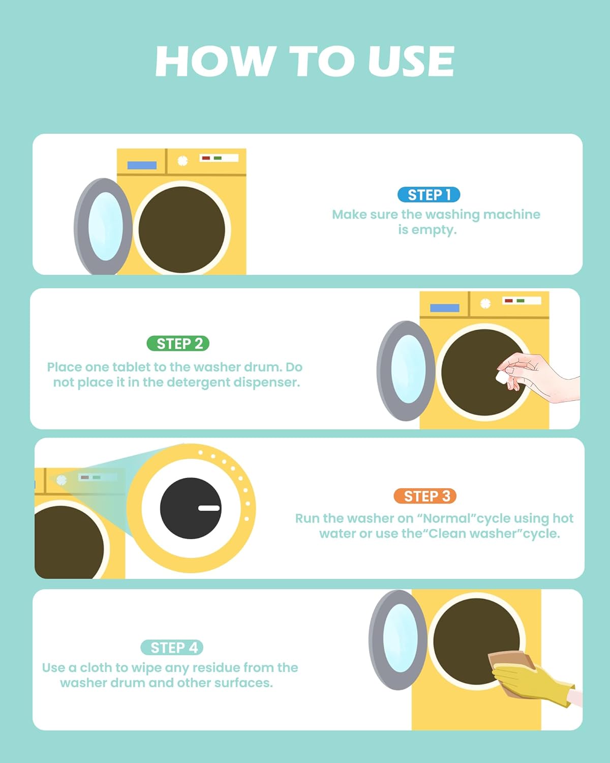 - How to Use: Place 1 tablet directly into the empty washing machine (use 2 tablets for heavy residue). Run a hot water cycle. As the tablet dissolves, its deep-penetrating foam thoroughly cleans every corner of the machine. Finally, wipe away any residue with a towel