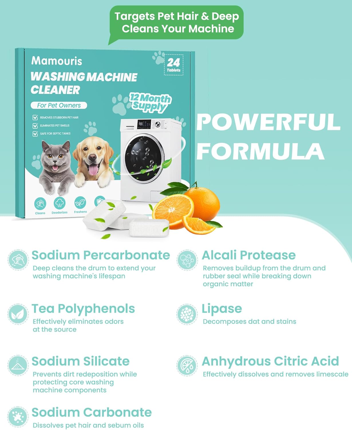 Washing Machine Cleaner Tablets: 24 Pack Deep Cleaning For HE, Front Loader & Top Load Washer, Removes Pet Hair, Odors, Designed for Pet Owners, Septic Safe, 12 Month Supply, Orange 11G