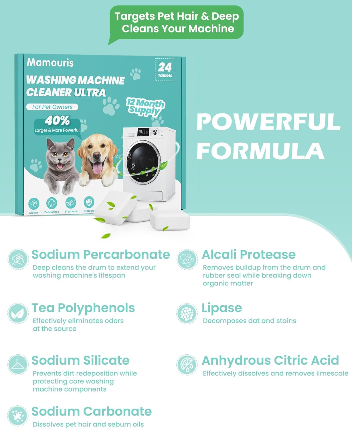Washing Machine Cleaner Tablets: 40% Stronger Cleaning Power, Deep Cleaning Tablets For HE, Front Loader & Top Load Washer, Removes Pet Hair, Odors, Formulated for Pet Owners, 24 Pack, 15G