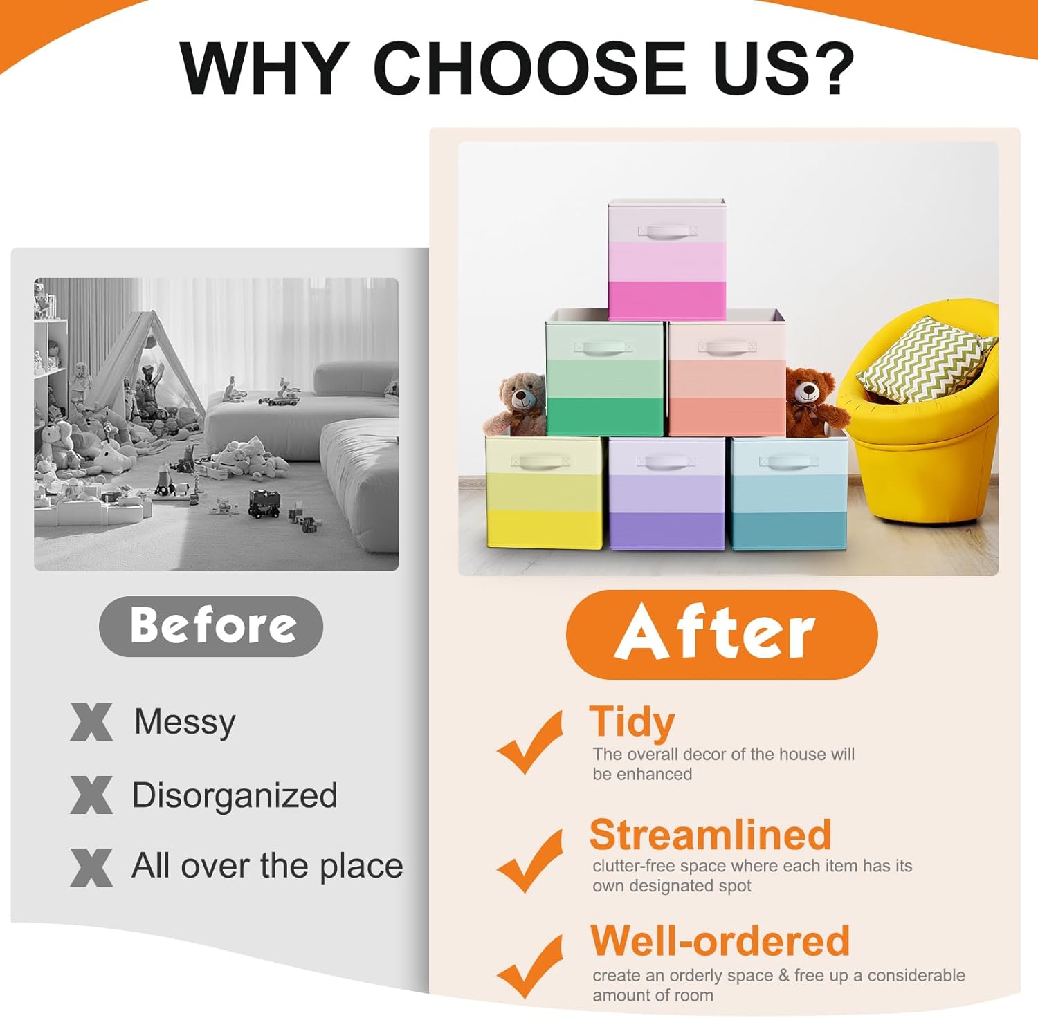 - Gradient tones: Elevate your organization with a touch of gradient perfection. Our set of 6 gradient-colored fabric storage cubes comes in an array of delightful hues: sky blue, rose pink, yellow, pink, lavender purple, and turquoise green. Each bin measures 10½"L x 10½"W x 11"H, perfectly sized to slot into your existing shelves or cabinets, adding a splash of color while keeping your space tidy