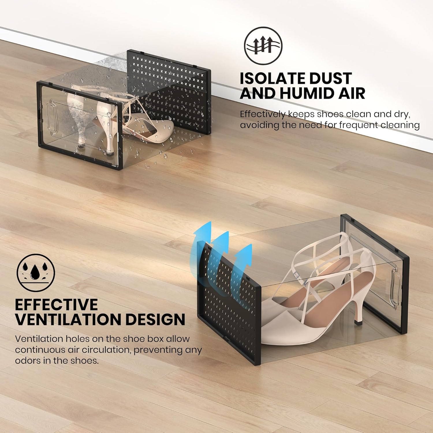 - Superior Shoe Organizer Solution: The lids of shoe boxes securely close to keep contents dust-free than traditional racks and provide better ventilation than closed shoe cabinets. Keeps your shoes fresh and dry while ensuring that they stay in great condition.