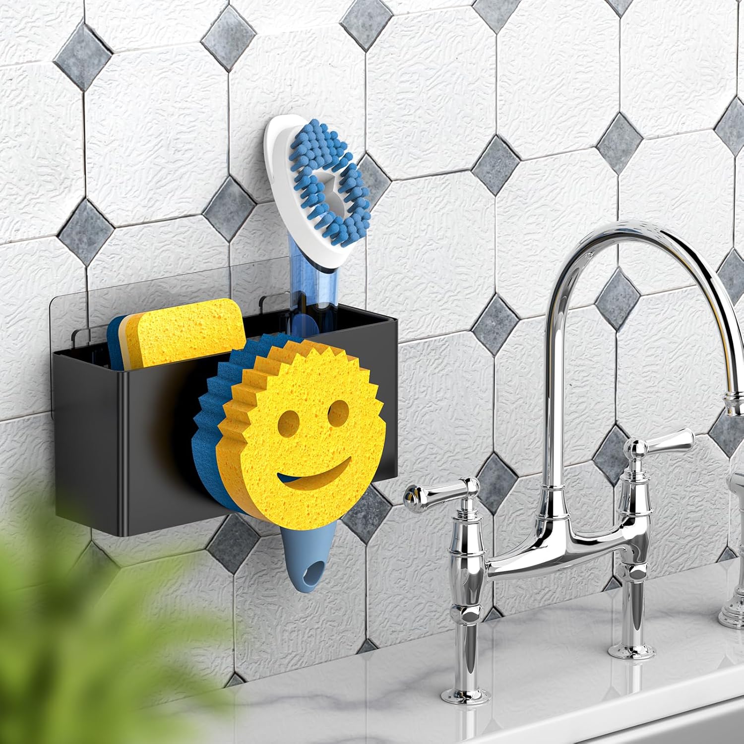 Sponge Holder for Kitchen Sink,Smiley Face Sink Caddy,Sponge Holder Stainless Steel with Suction Cups & 1 PCS Adhesive Strips for Holding Soap,Brush,Scrubber,Sponge-Black