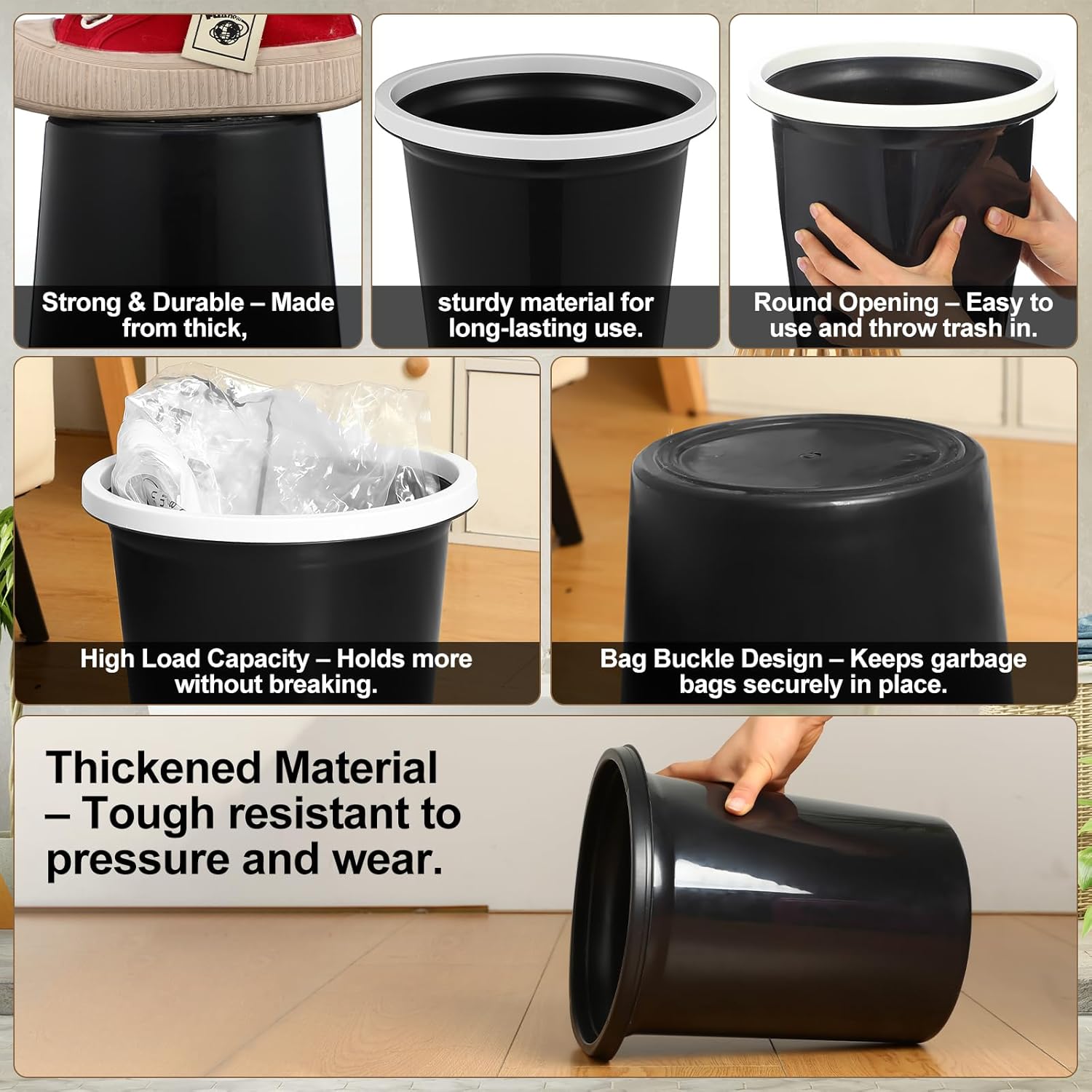 • Sturdy and Durable: these small round trash cans are made of quality plastic material with appropriate thickness, reliable material, exquisite workmanship, light weight but sturdy, not easy to wear, deform or break, allowing you to use it with confidence