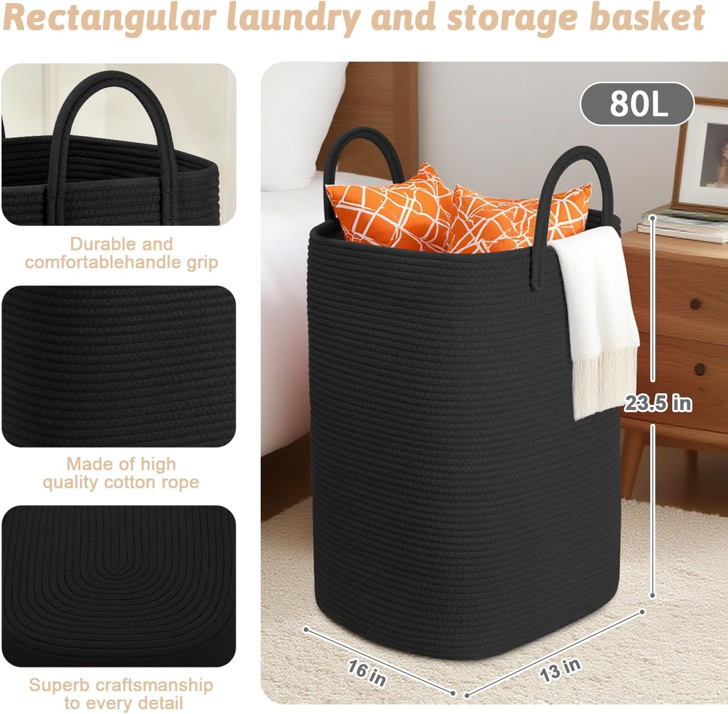 Laundry Basket,Woven Cotton Rope Laundry Hamper,80L Versatile Storage for Dirty Clothes,Baby Toys,and Blankets in Bathroom, Nursery,and Living Room