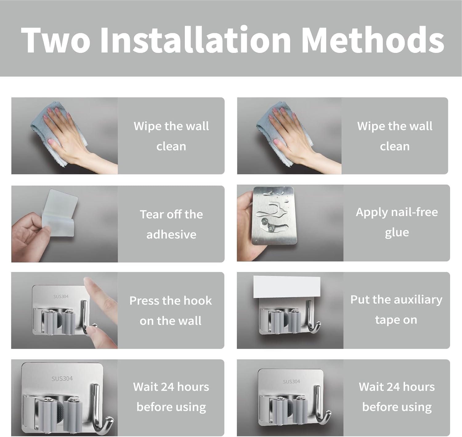 • Nail free and Wall Protect: Two installation methods: Install with adhesive tape or Glue. First method is Self Adhesive broom hanger keep no drilling holes in the wall. It is Suitable for small items, brooms, mops, Umbrellas, Toilet Brushes, etc. Note that this method only applies to Marble, Smooth Tiles, Glass, Wooden Board, Metal Panel, Acrylic Plate. Adhesive holder load-bearing capacity reaches 3kg.
