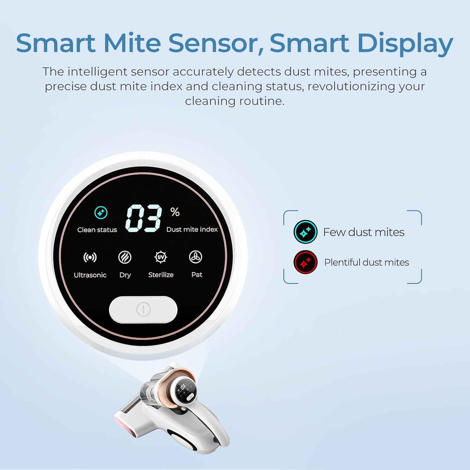 - Smart Mattress Vacuum Cleaner: The mattress vacuum continuously detects allergens on the surface,when detected the indicator turns red, when the indicator light turns green, it means the area has been thoroughly cleaned.Our bed vacuum combines powerful ultrasonic+high-frequency tapping+strong suction+UV+heating+Smart Sensor, 5 in1function remove various visible dust and invisible-allergens for deep cleaning.