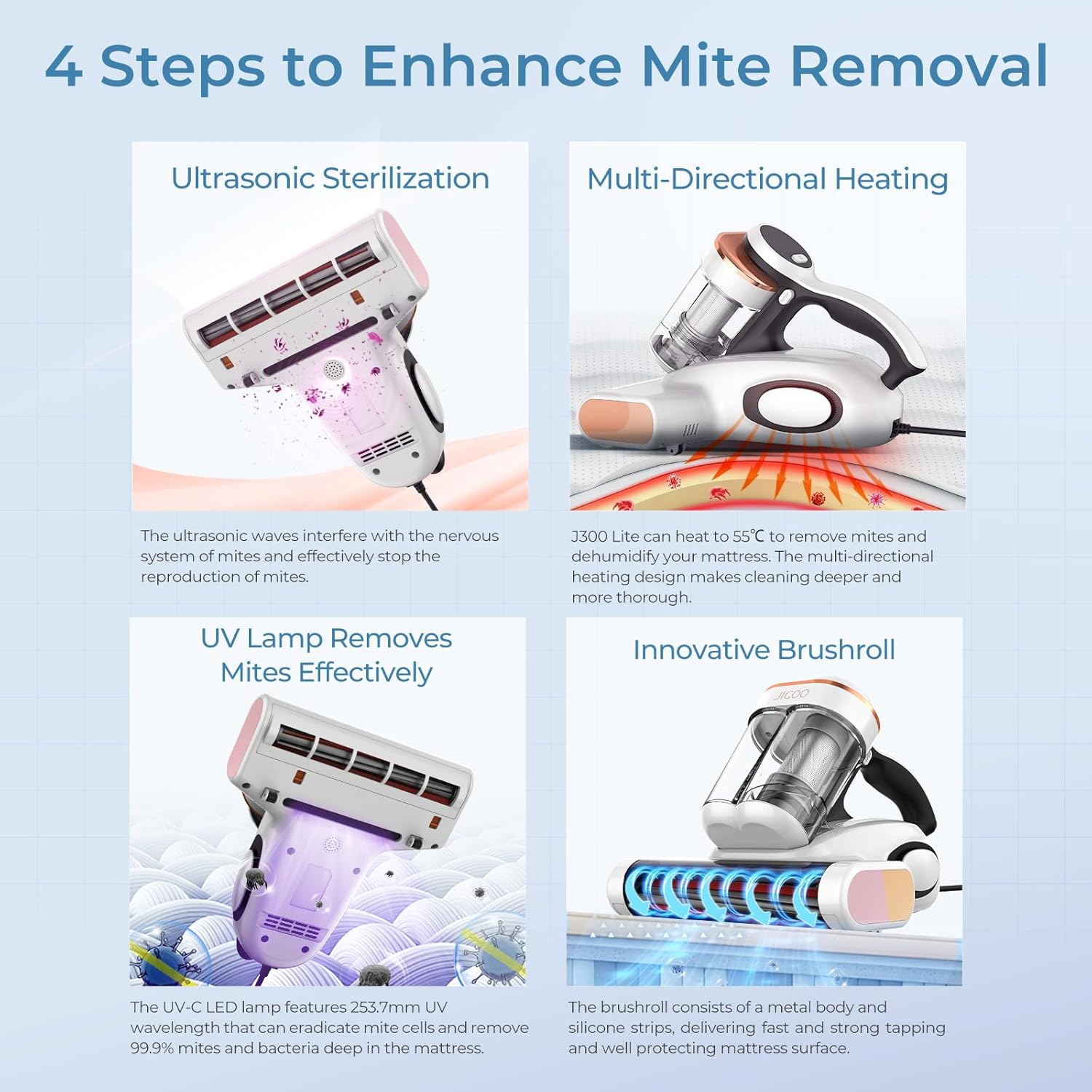 - Deep Cleaning: J300 Lite mattress vacuum cleaner features a 13KPa suction power and high frequency vibration technology, effectively lifting embedded dust, pet hair, and debris from deep within fabrics. Its advanced filtration system ensures thorough cleaning while saving time and effort.