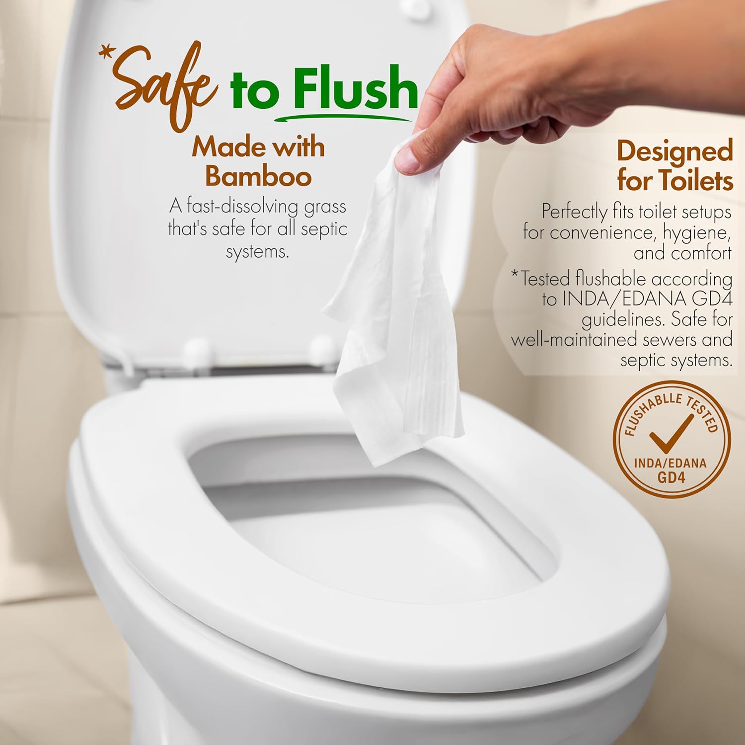 • Crafted from FSC Certified Bamboo Viscose – Silky-smooth, tear-resistant, biodegradable flushable wipes for adults; gentle enough for daily personal care. Made from material certified by GTTC and INDA/EDANA (GD4)