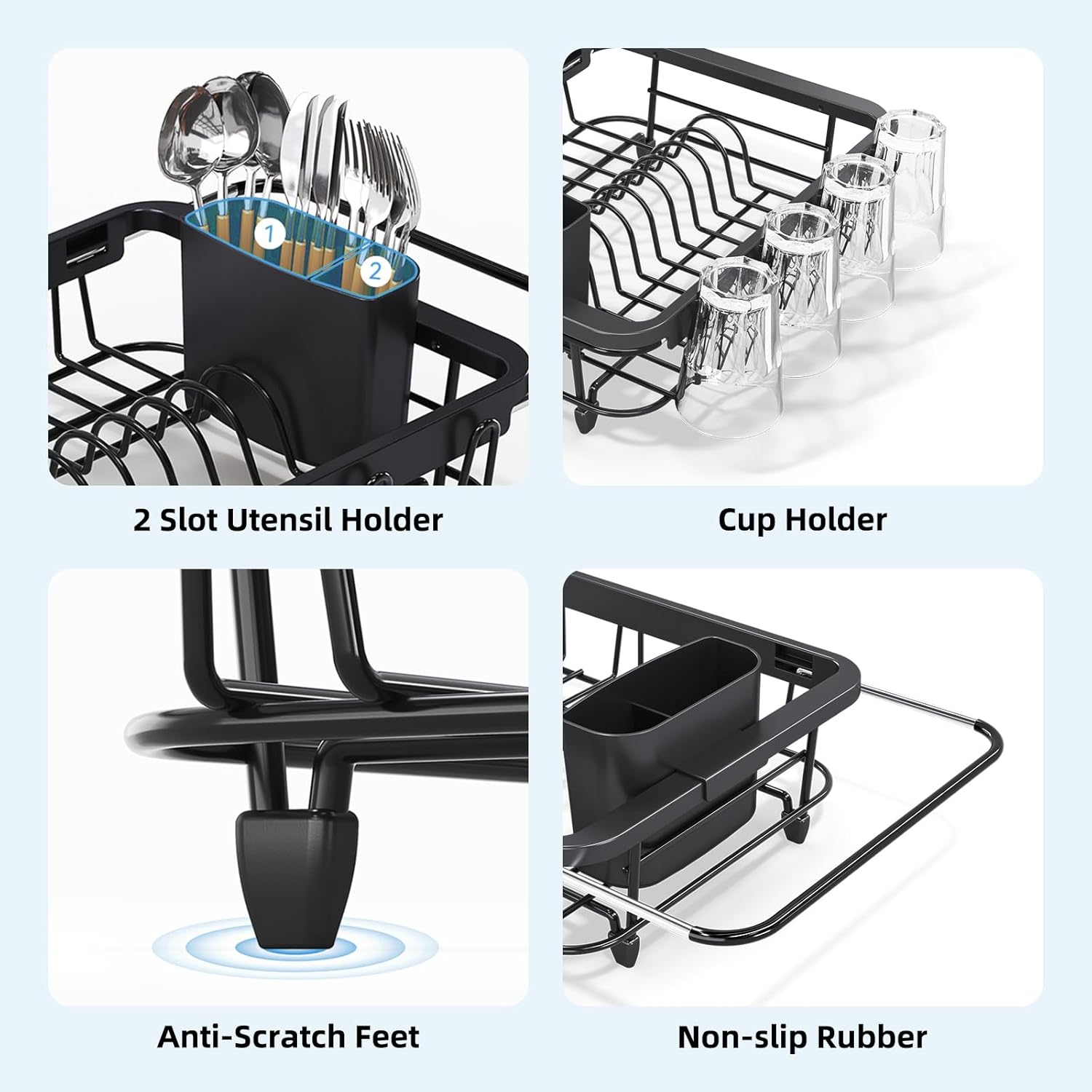 • [ 6 IN 1 MULTIFUNCTIONAL ] Urackify sink dish drainer includes a 2-grid utensil holder, rack for storing 8 dishes, 1 cutting board, 8 Glasses, fruits and vegetables. You can have your various tableware well-organized with Urackify in sink dish drying rack.
