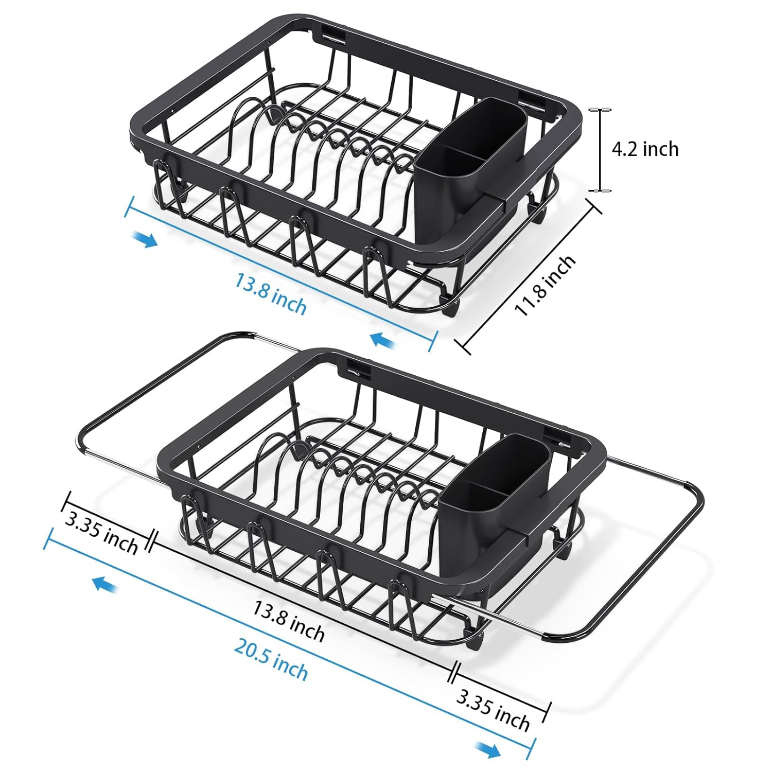 • [ EXTENDABLE & SUITABLE ] Urackify expandable over sink dish rack(collapsed) measures 13.8"(35cm) L x 11.8" (30cm) W x 4.2" H (10.7cm) , extendable from 13.8" to 20.5" length to make it handy to place over a larger sink, fit your sink which is 13.8 to 20.5 inches length.
