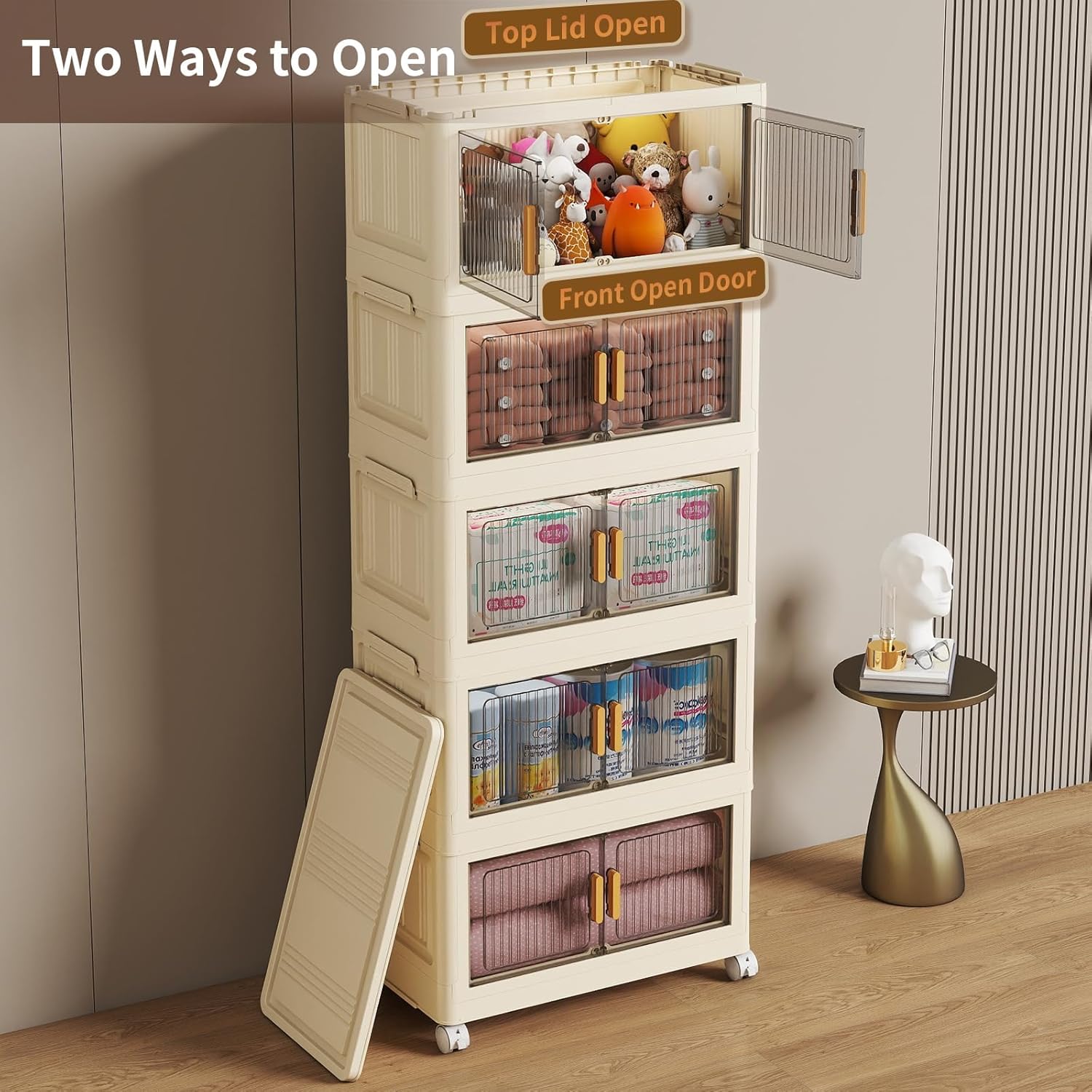 • Stackable & Removable Design: Foldable storage bins and a stackable storage box. Each level has matching grooves and clasps on the top sides to lock the storage bins securely, and the foldable design maximizes space in your home when not in use. There are five rotating wheels on the bottom for easy movement