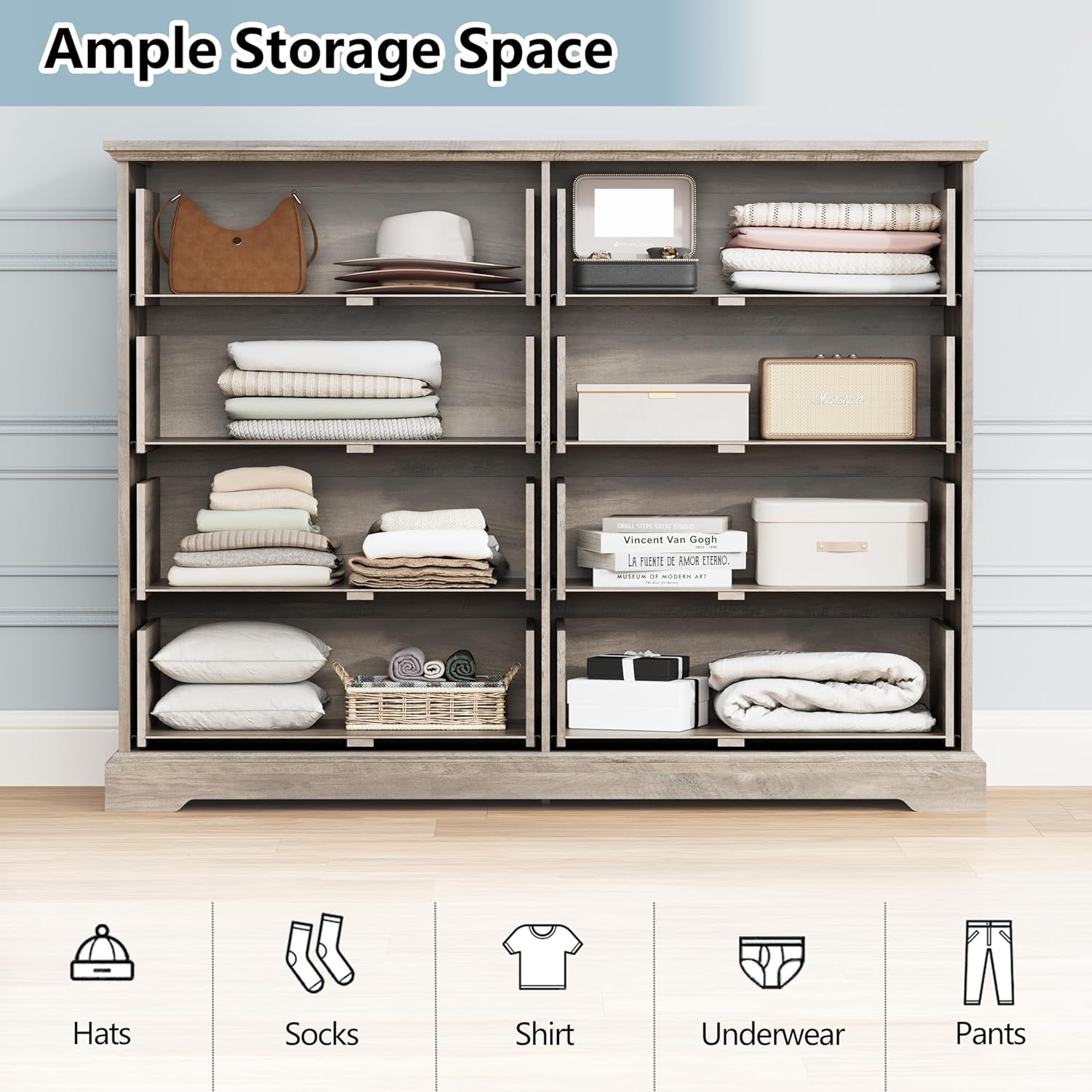 8 Drawer Dresser for Bedroom, 47" Wide Wooden Chest of Drawers, Rustic Farmhouse Dresser with Large Drawers & Metal Handles, Modern Storage Organizer for Closet, Living Room, Hallway, Grey