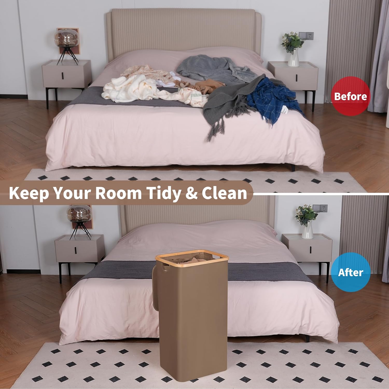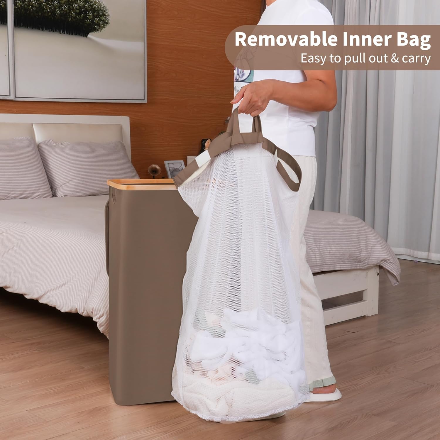 • Bamboo Handles & Removable Liner - Our laundry bin features smooth, splinter-free bamboo handles for easy carrying. The detachable inner bag allows quick sorting and machine washing, making laundry day effortless.