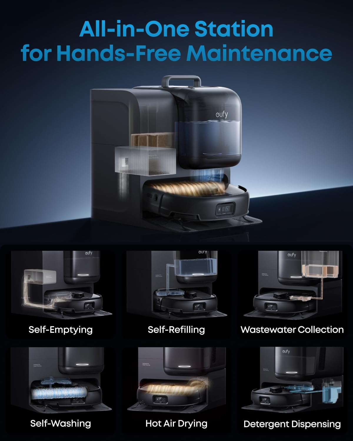 • All-in-One Station: Streamlines daily cleaning with self-emptying, self-washing, self-refilling, hot air drying, automatic detergent dispensing, and wastewater storage.