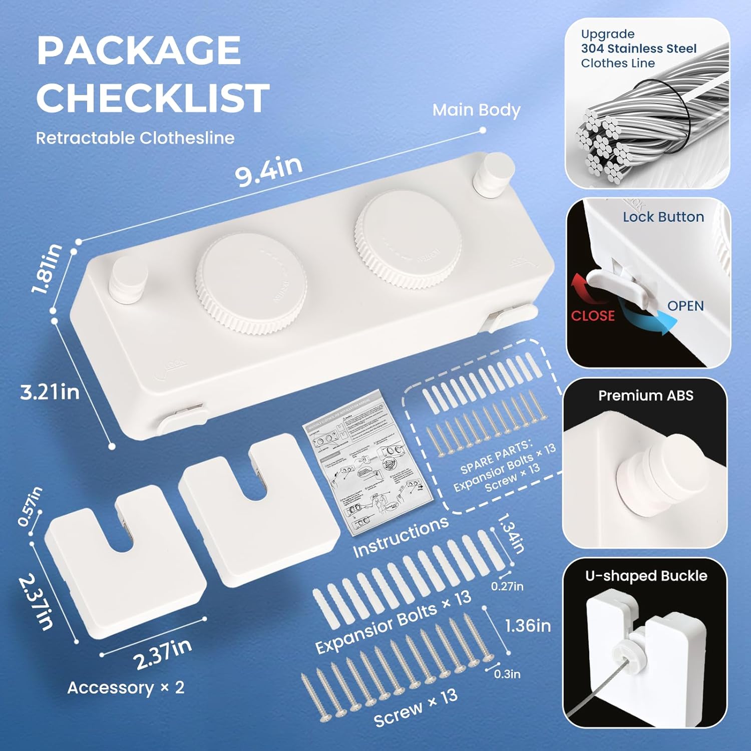 • 【Retractable Clothesline Indoor Outdoor Heavy-Duty】 Upgrade 304 Stainless Steel Clothes Line anti-sag design supports Single rope 40lb double rope use 70lb . Features a knob-locking mechanism for stable drying of heavy items like Outdoor Drying Rack Clothing blankets and jeans.