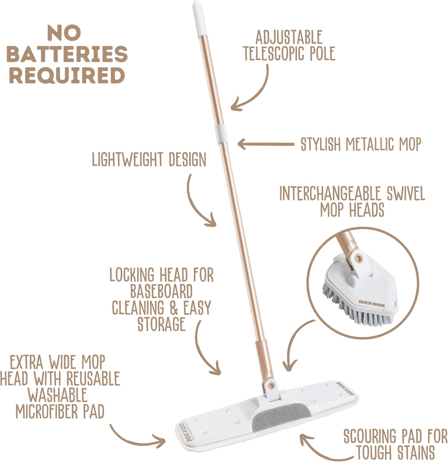 Quick Shine Ultimate Gold Clean + Polish Mop Kit | All-in-One 11 Pc Kit w/Interchangeable Attachments | Cleaner & Polish Included | No Batteries Needed | All Floors Pro Cleaning System | 2-in-1 Mop