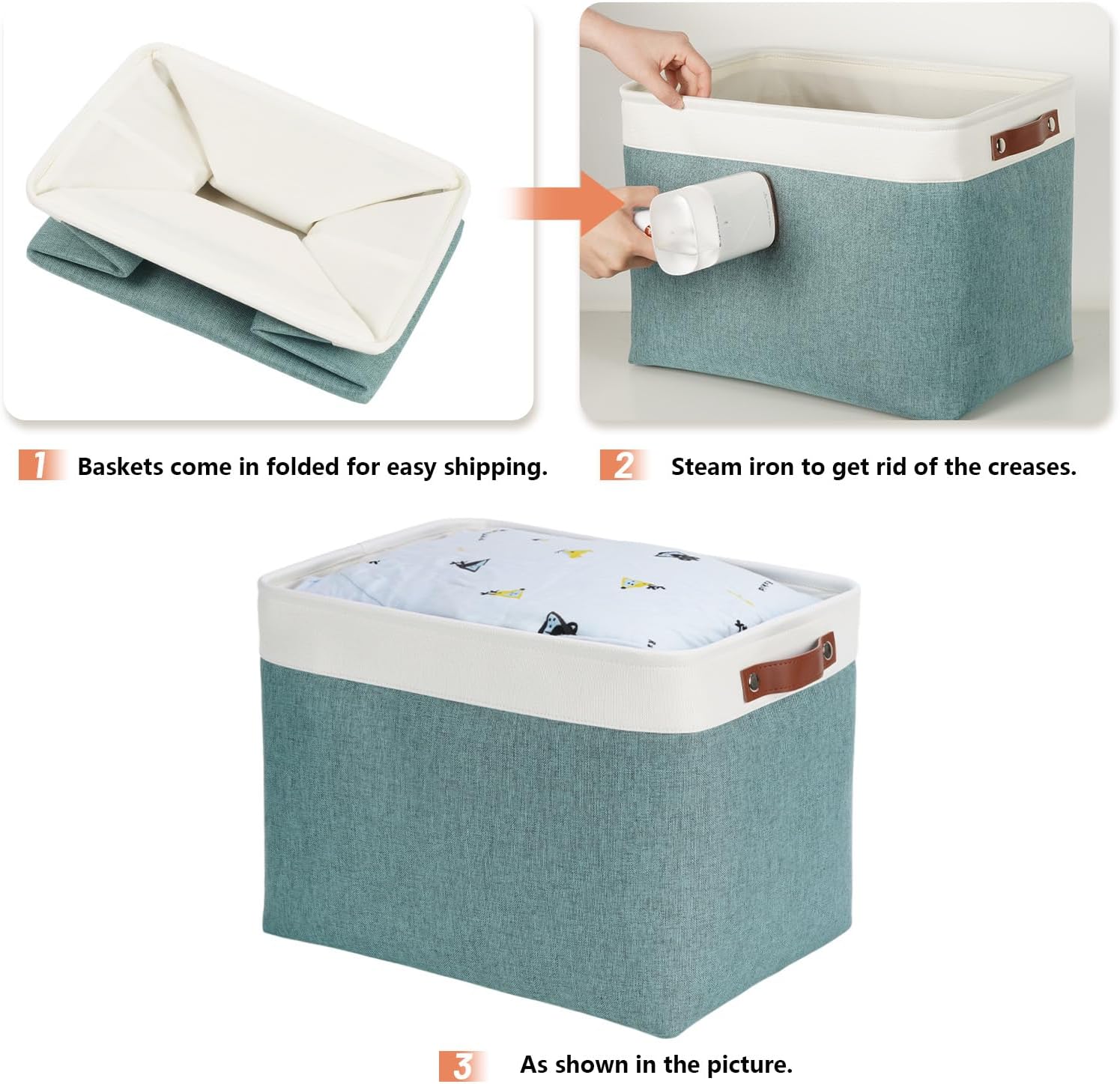 • STURDY & RESISTANT: Set of 3 , dimensions(each): 16(L) x 12(W) x 12(H) inches. Premium Materials, resistant and has no odor. The leather handles and metal iron buckles are sturdy.The sturdy handles make fabric storage baskets easy to carry or pull off and out of shelves.