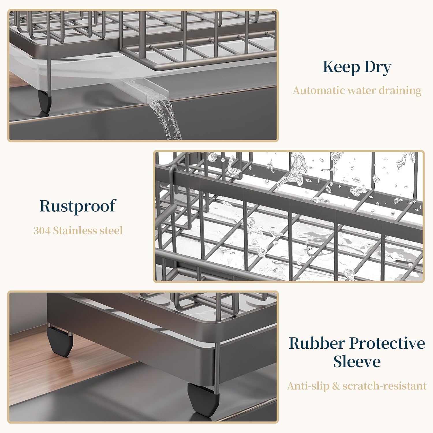 - [Anti-Slip Rubber Feet]: The bottom of the kitchen sink sponge holder is equipped with anti-slip rubber pads on each leg, providing a secure grip that prevents sliding or tipping over. Whether placed on a wet kitchen sink sponge holder or a dry counter, the added friction ensures stability and peace of mind. A smart solution for safer, clutter-free kitchen soap holder organization