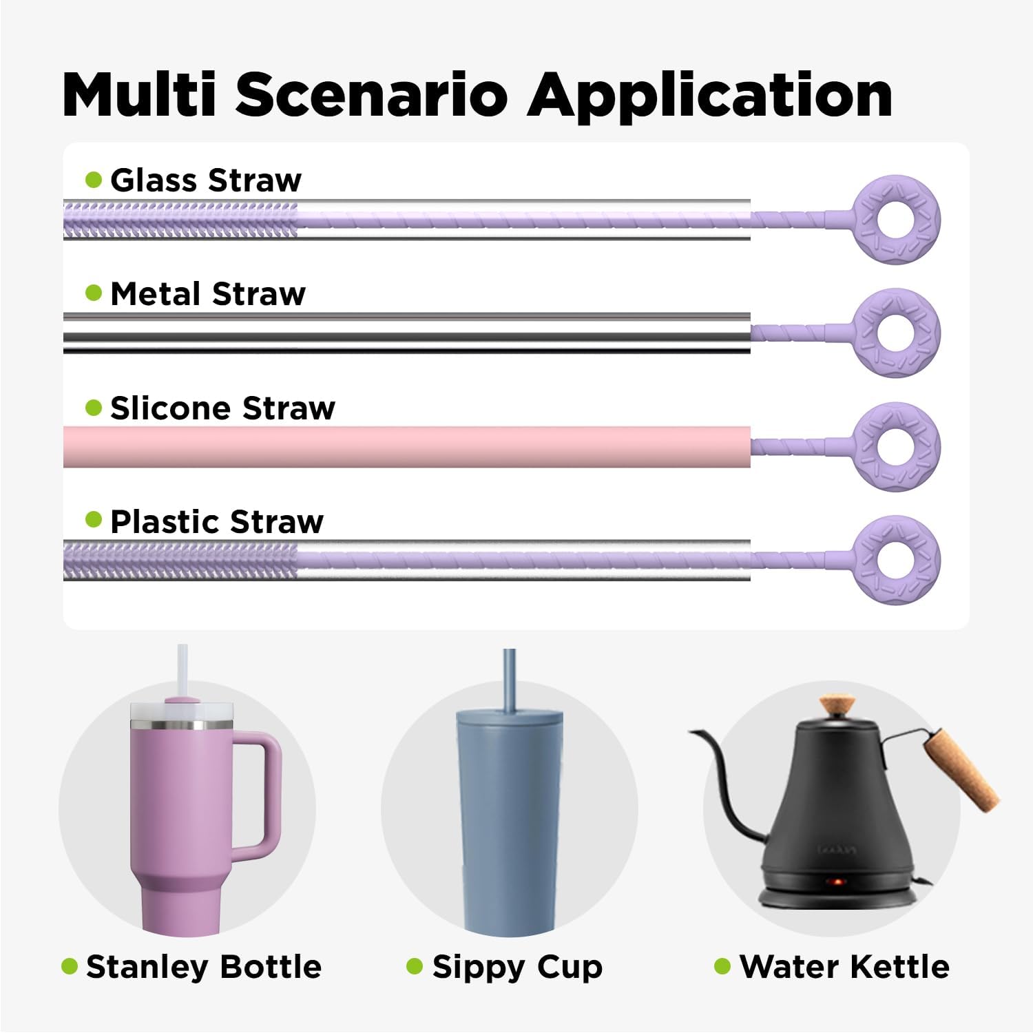 • Safe Food-Grade Silicone: Made of premium silicone that withstands high temperatures up to 356°F. Safe for boiling water and steam cleaning. Soft, fine bristles won’t scratch the straw’s inner wall but easily remove stubborn stains.